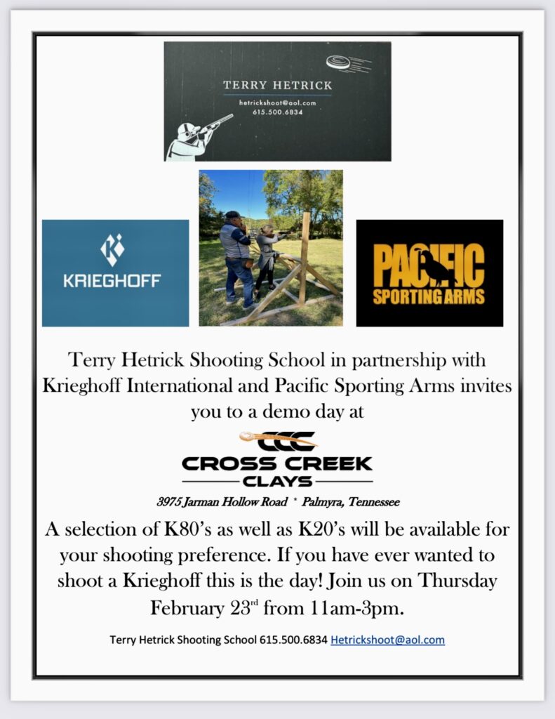 Terry Hetrick in partnership with Krieghoff and Pacific Sporting Arms invites you to a “Demo Day” at the Cross Creek Clays on 2/23/23.