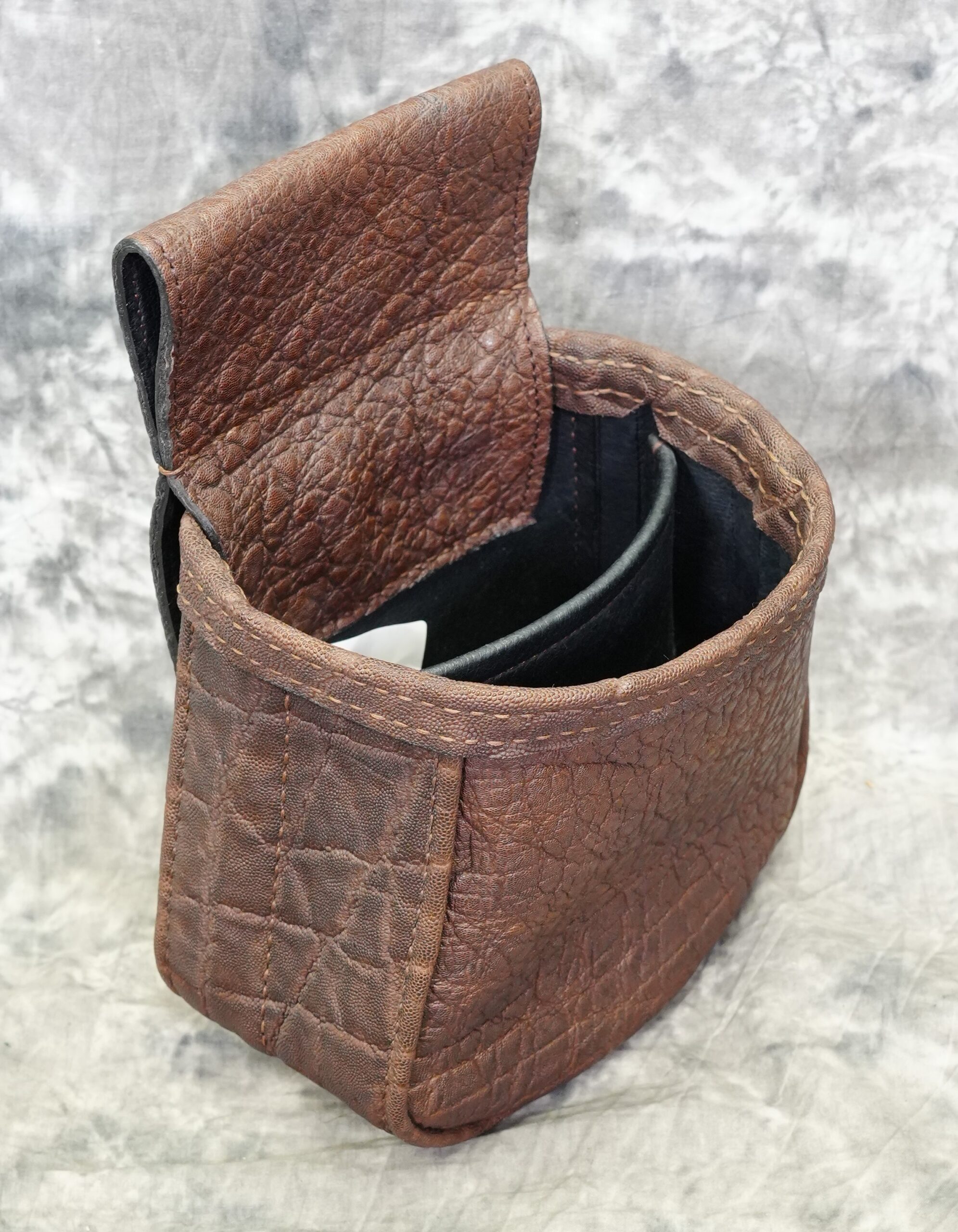Ange Elephant Shooting Pouch. hand made from legally purchased elephant hide to the highest standards. Each pouch is hand stitched by Al Ange. Matching belts can be made to your size at an additional cost.