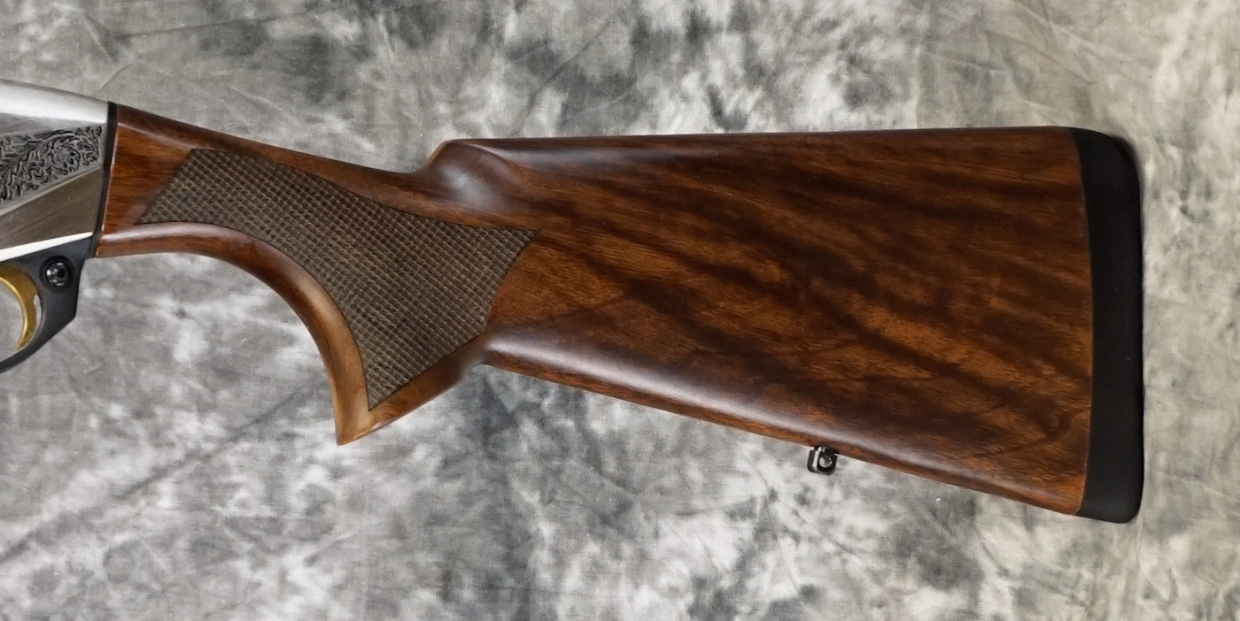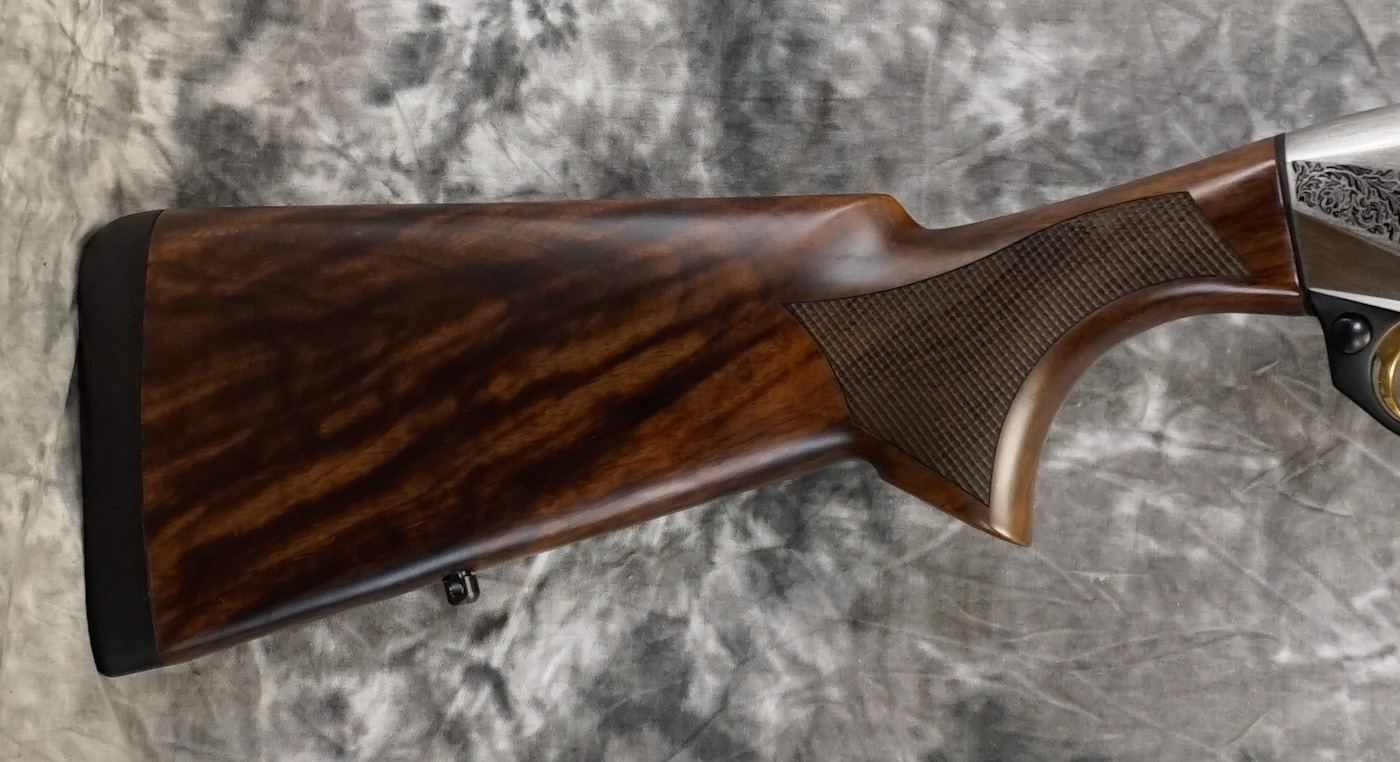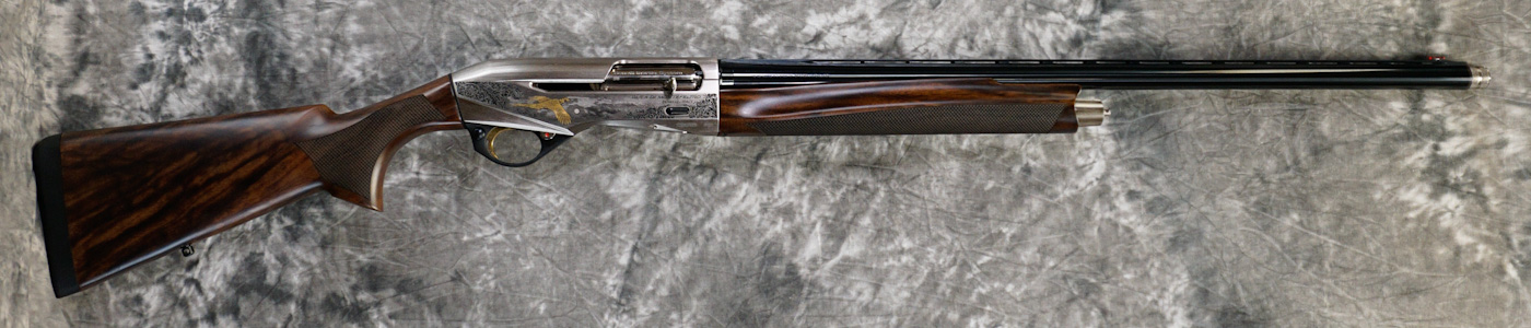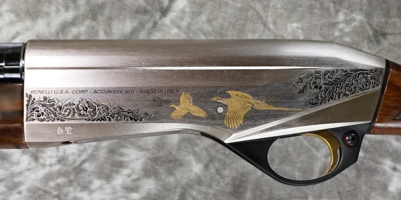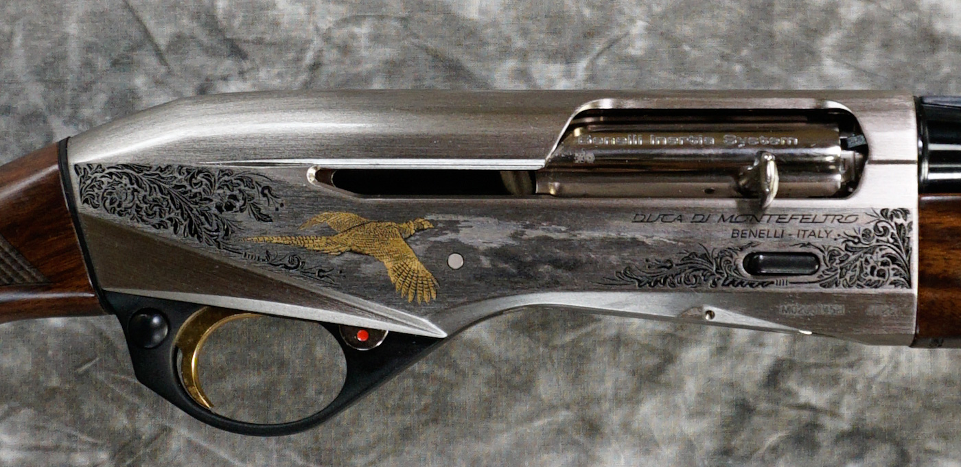 Benelli Montefeltro Silver Featherweight 12ga. Features 28″ barrel with ventilated rib and flush-fit choke tubes. Inertia-driven action for reliable, low-maintenance performance. Nickel receiver with game scene engraving, paired with a lightweight walnut stock for quick handling in the field.