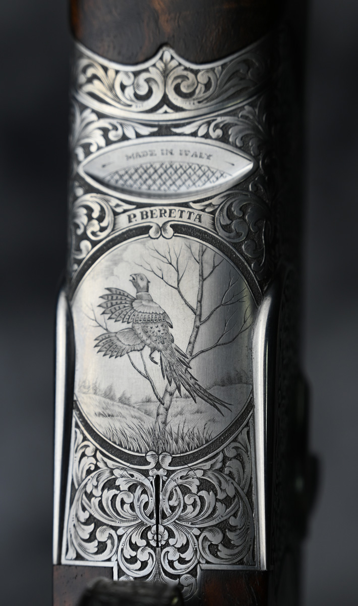 Pre-owned, in very good condition with minor handling wear, Beretta SO6 EELL English Sporter 12ga. Features fixed choke improved cylinder and modified 29 1/2″ barrels with flat sporting rib. Engraved side lock receiver featuring upland and waterfowl game scenes complimented by elegant deep scroll patterns, pierced top lever with gold crown and fixed selectable trigger hand engraved by Italian master engraver G. Ferraglio. Outstanding right hand Sporting stock with Round forend. Comes in factory leather presentation case.