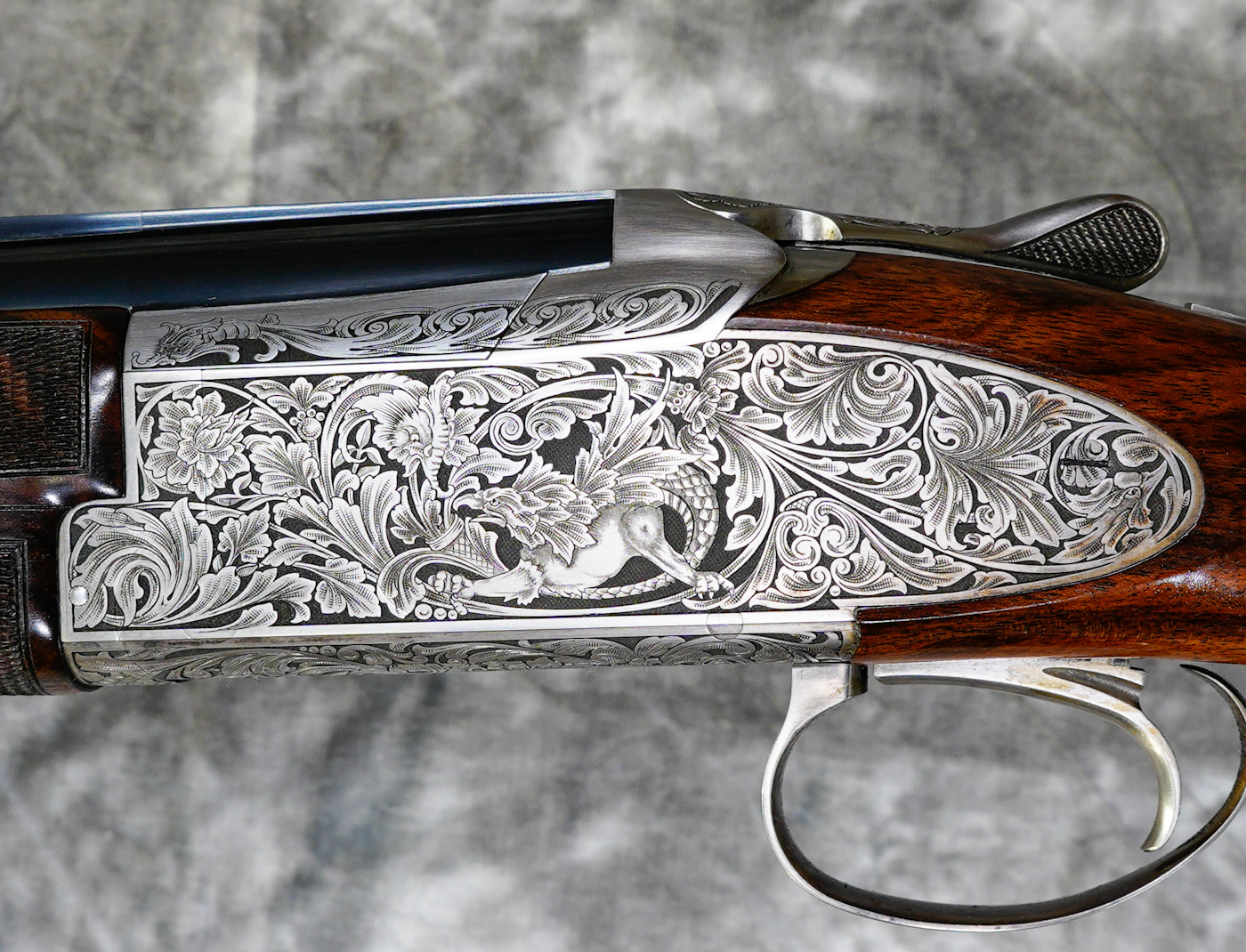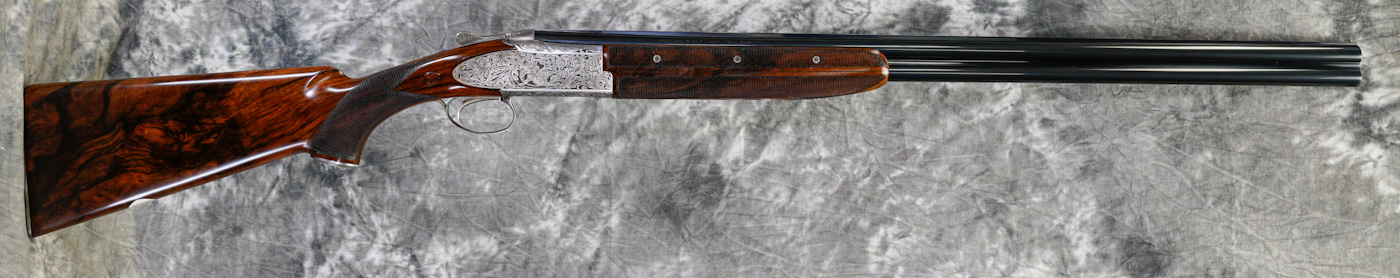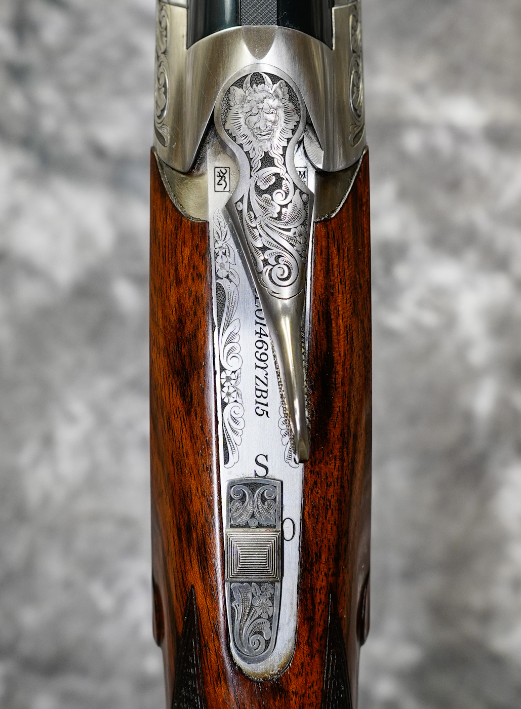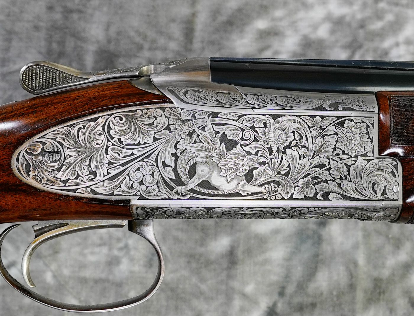 Pre-Owned Browning B15 E Grade Game Gun 20GA with 30″ Optima DS choked barrels, parallel hand-filed game rib. Nitride finished action featuring finely engraved sideplates with highly detailed scrolls, mystic scenes. Exhibition grade pistol grip stock with long-tang, grip cap and skeleton butt plate, fully checkered faux three piece forearm. Excellent condition, well cared for only minor signs of use. Includes presentation and shipping cases, chokes. Ineligible for trade-ins.