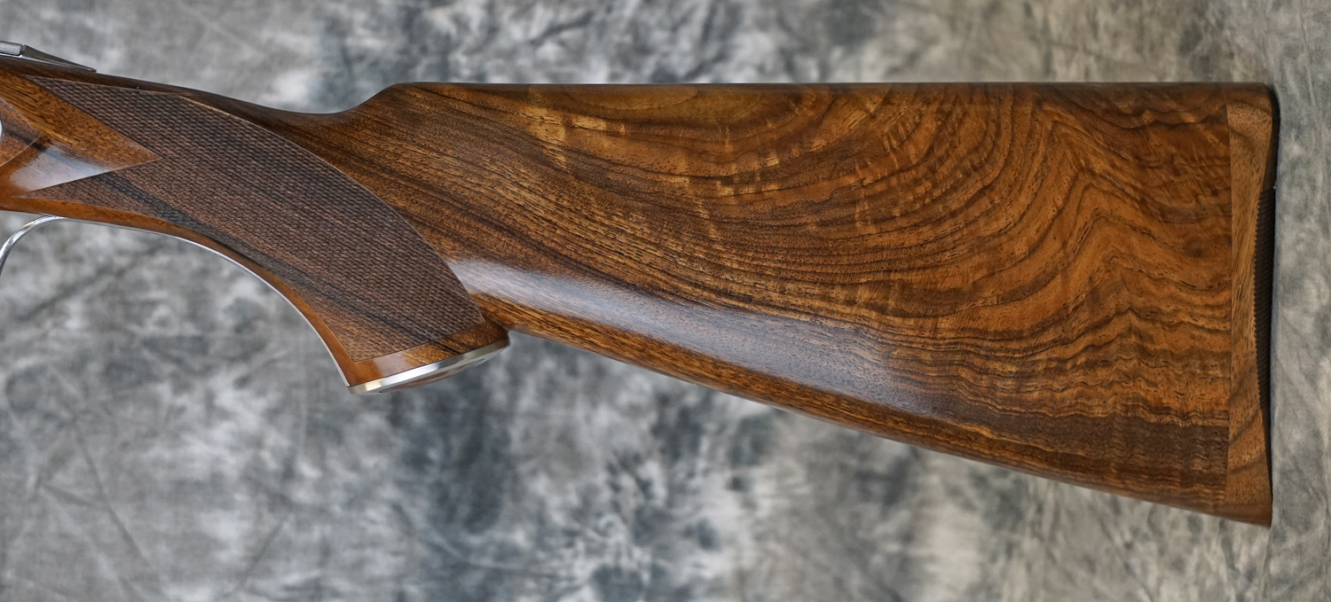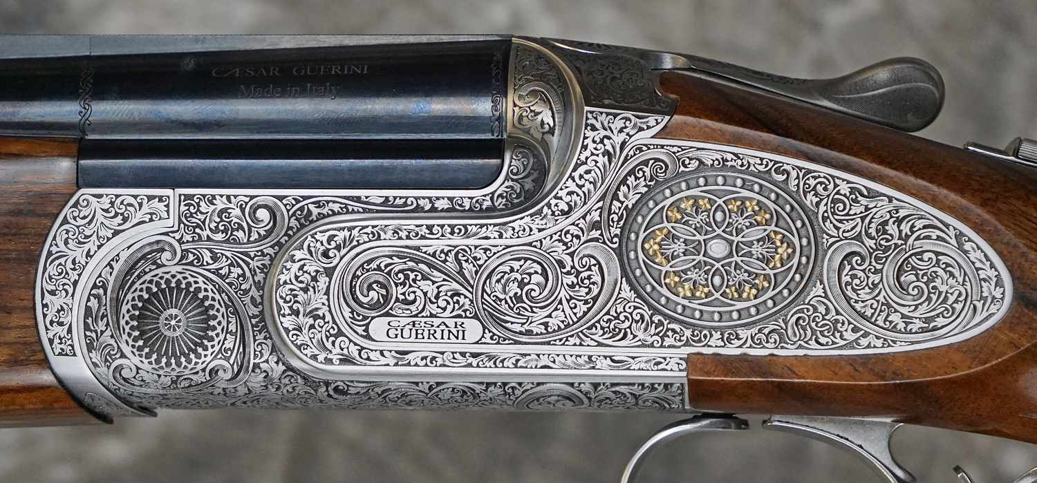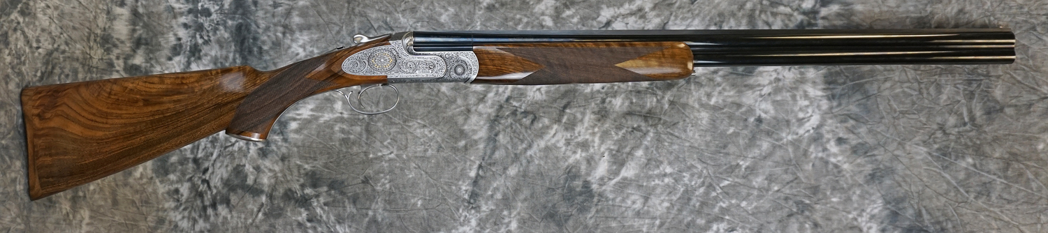 New Caesar Guerini Apex Field 20GA with 28″ factory choke tubed barrels, solid game rib and solid side-ribs. Silver nitride finished action featuring highly detailed scroll engraved sideplates with gold inlaid medallions, long tang and engraved grip cap, slim game forearm. Highly figured pistol grip game stock. Includes factory case, chokes and tools. Call 626-633-1002 for pricing.