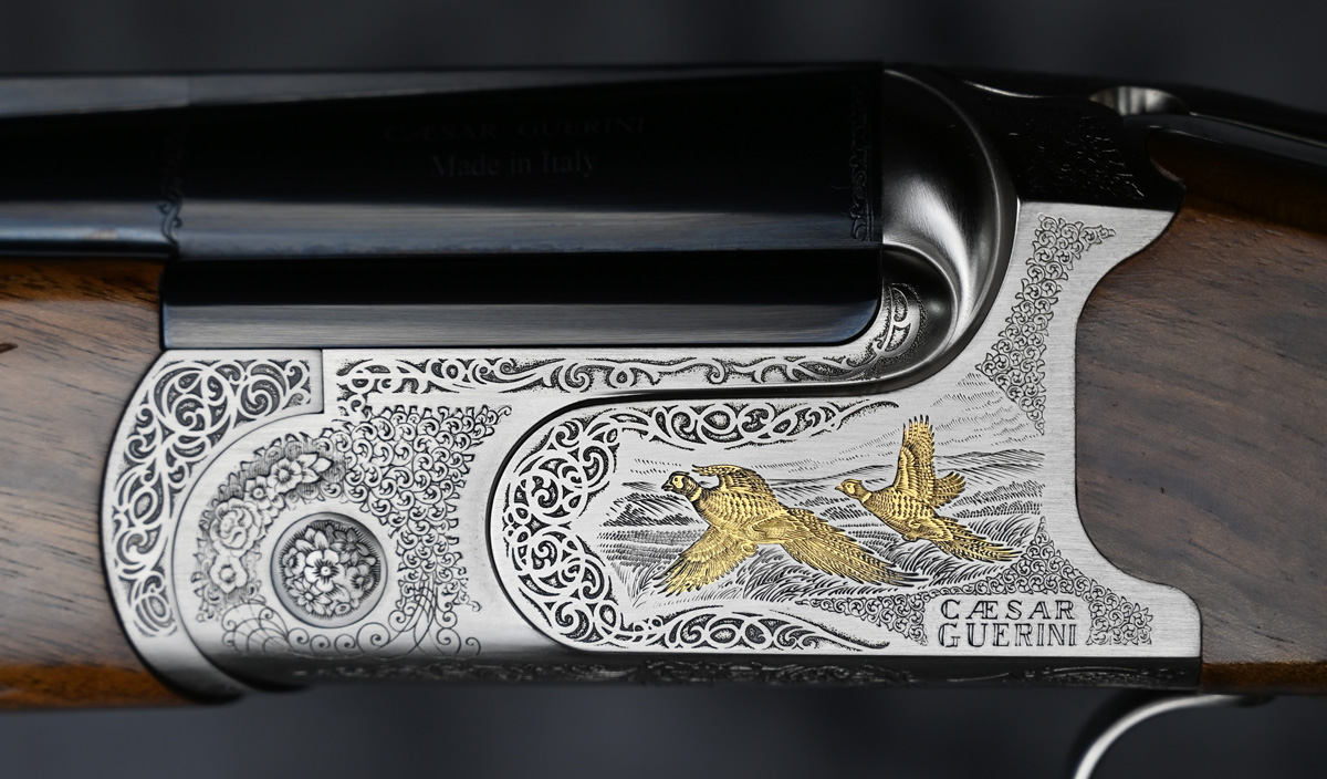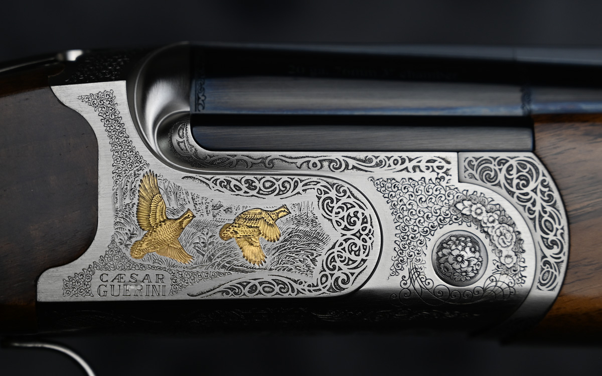 New Caesar Guerini Tempio Field 20ga. Features factory flush choke tube 28″ barrels with thin field rib. Engraved receiver featuring elegant scroll patterns complimenting upland games scenes in gold with fixed selectable trigger. Highly figured left hand Prince of Wales stock with wood checkered buttplate and Schnabel forend. Comes in factory case.