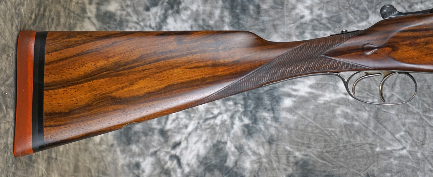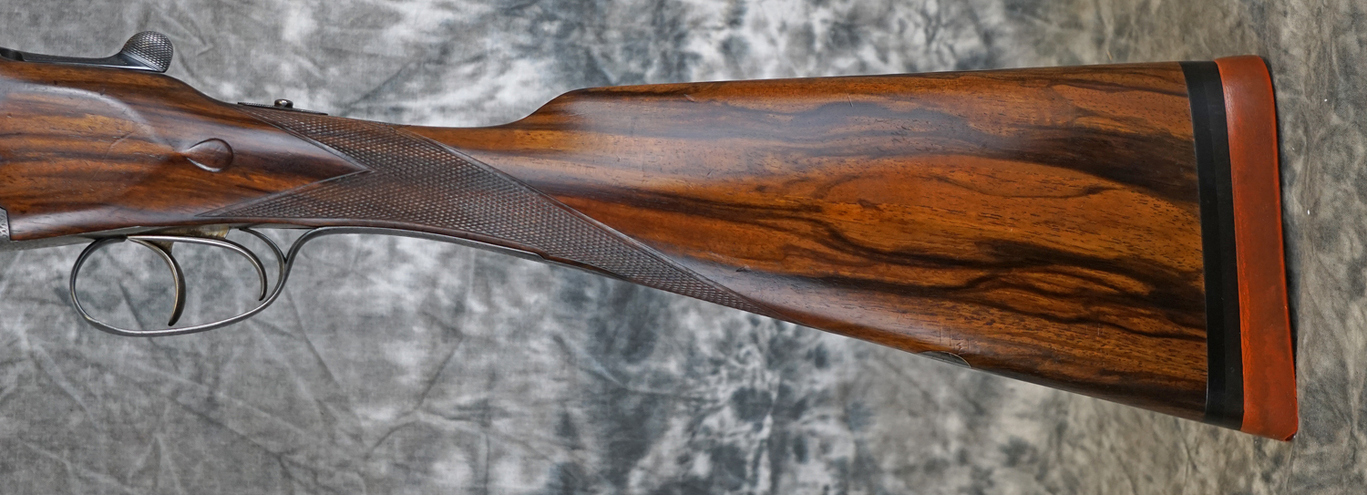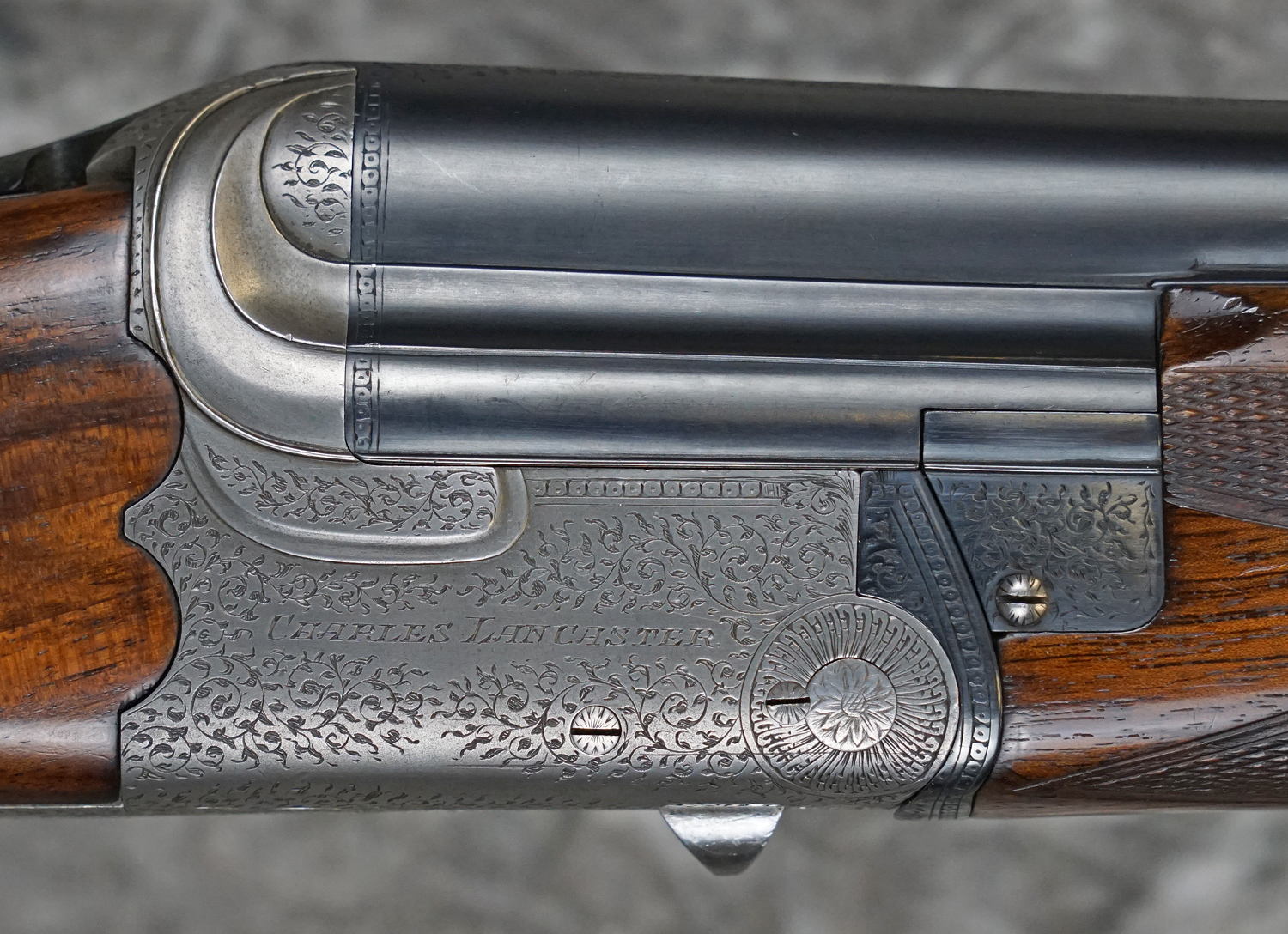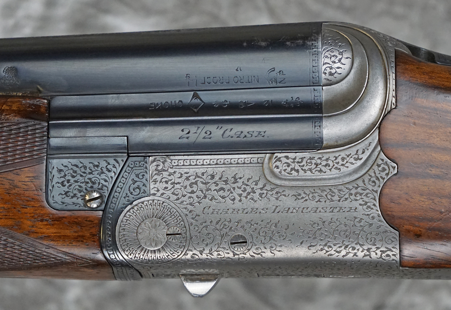 Pre-Owned Charles Lancaster Over/Under Game 12GA with 28″ fixed choke (.004/.004) barrels, no top-rib with 2 1/2″ chambers; nitro proofed. Scalloped coin-finished action with fine English scrolls, double triggers and ejectors. English straight-hand stock to recoil pad, field forearm. Likely light restoration work performed on gun, barrels have minor bluing wear, bores are bright and do not show pitting or corrosion. Unique early English O/U shotgun. Includes trunk case, consignment ineligible for trade-ins.