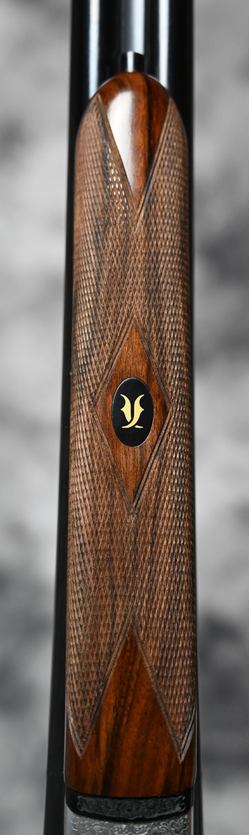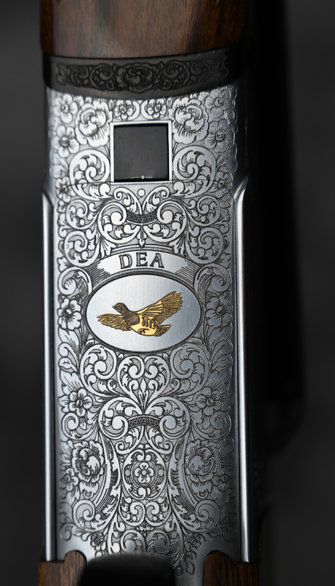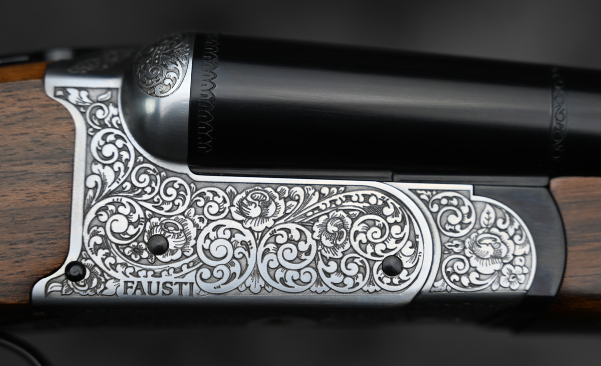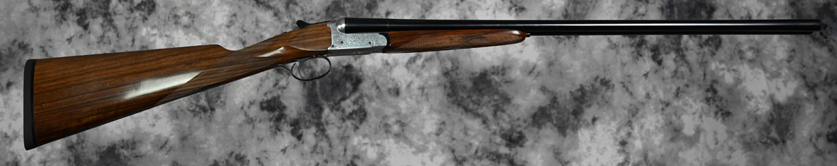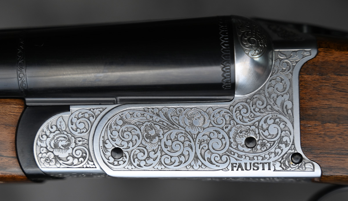 New Fausti DEA SxS 20ga. Features flush choke tube 30″ barrel with thin field rib. Coin receiver featuring elegant scroll patterns with fixed trigger. Highly figured right hand English stock and Splinter forend. Comes in factory case.
