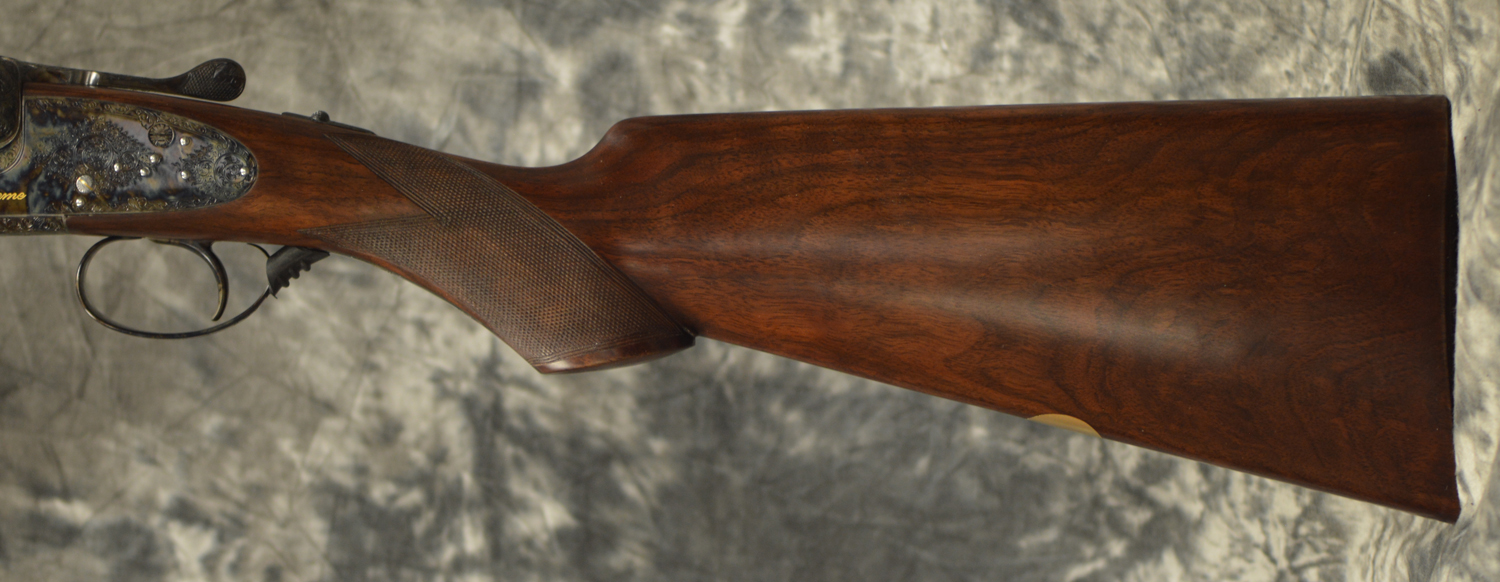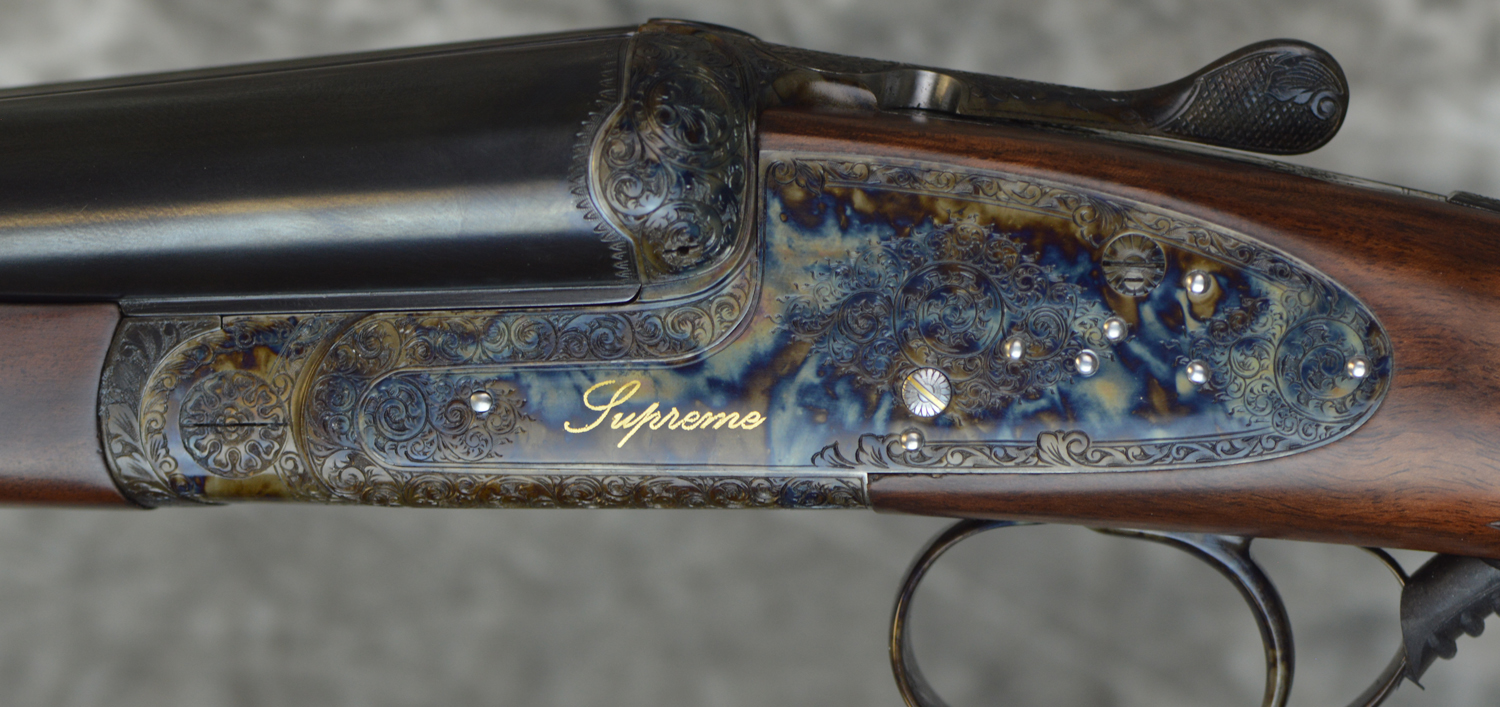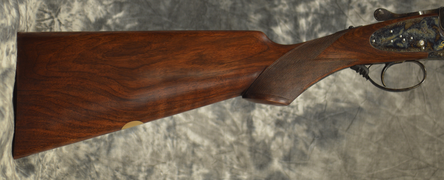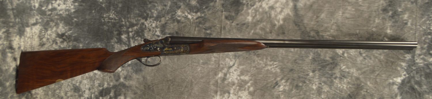 New Grulla Supreme Sidelock Ejector Game 12GA with 30″ fixed choke (IC/M) barrels, chrome lined and steel proofed; rust-blued with swamped game rib. Factory case-color hardened Seven Pin Style round action with hand-engraved scrolls and gold inlay; side-clips with plugs; self-opening. Factory Purdey style pistol grip to checkered butt and full beavertail forearm, single non-selective trigger. Includes factory leather presentation case.