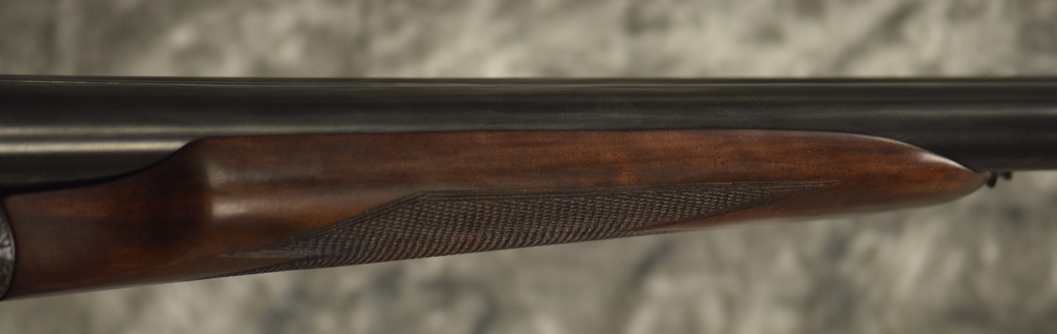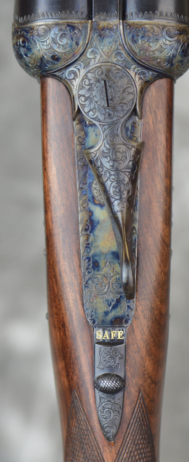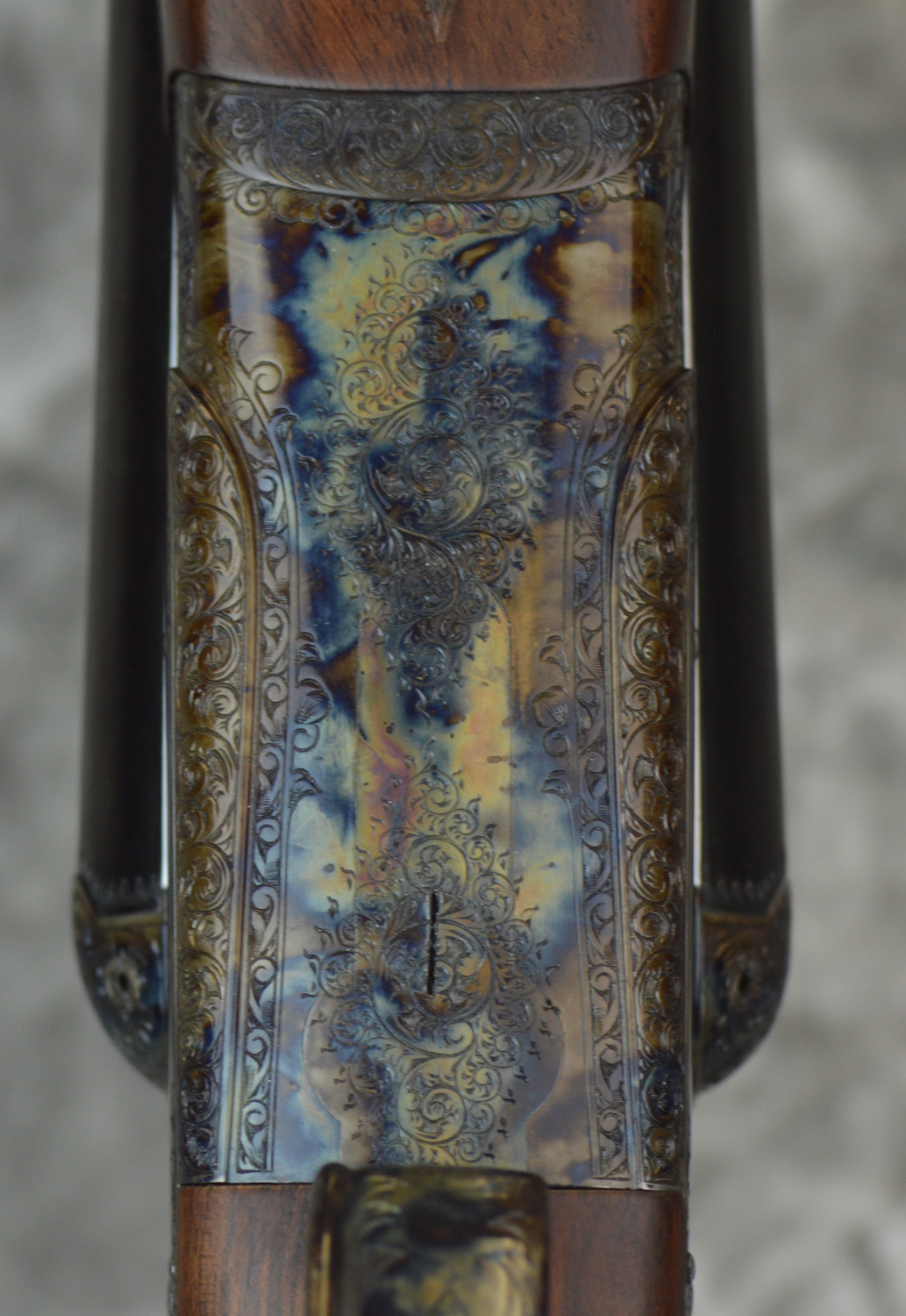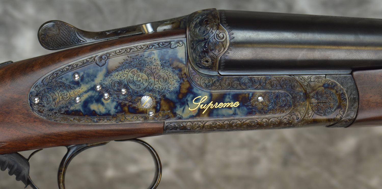 New Grulla Supreme Sidelock Ejector Game 12GA with 30″ fixed choke (IC/M) barrels, chrome lined and steel proofed; rust-blued with swamped game rib. Factory case-color hardened Seven Pin Style round action with hand-engraved scrolls and gold inlay; side-clips with plugs; self-opening. Factory Purdey style pistol grip to checkered butt and full beavertail forearm, single non-selective trigger. Includes factory leather presentation case.