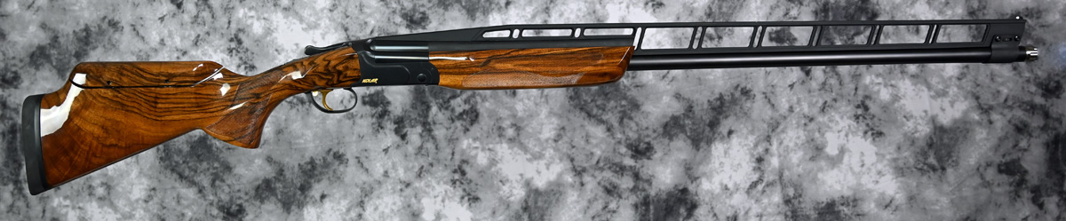New Kolar Low Profile Trap combo 12ga. Features factory extended titanium choke tube 34″ unsingle barrel with low profile adjustable rib, factory extended titanium choke tube 32″ over under barrel with low profile adjustable rib. Blued receiver featuring Classic gold engraving with Kolar crest and removable selectable trigger. Highly figured right hand Monte Carlo Trap stock with adjustable comb and Beavertail forend. Comes in factory 2 barrel case.