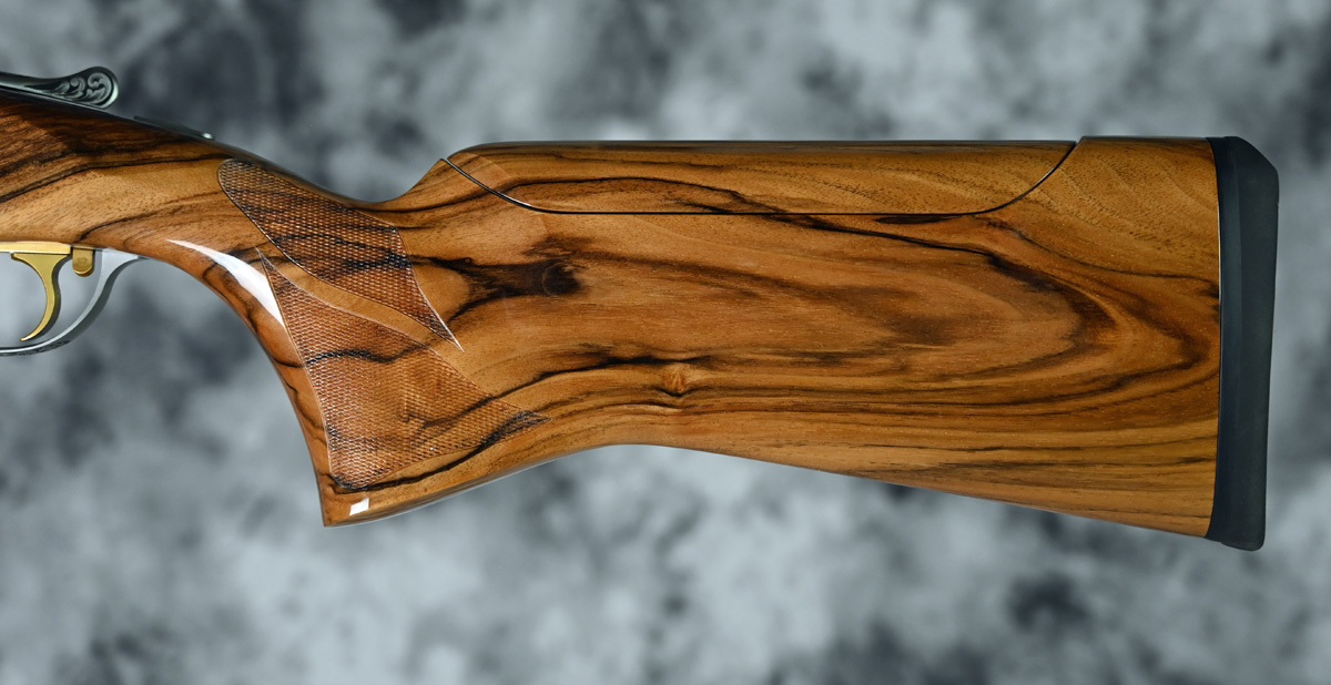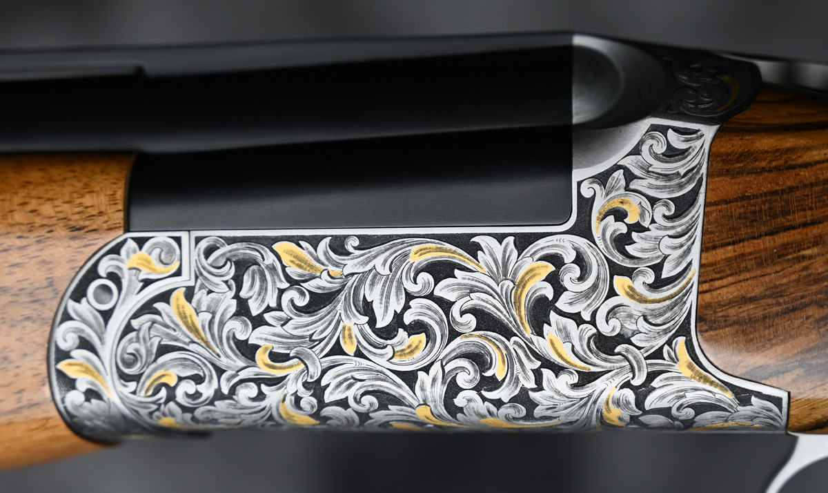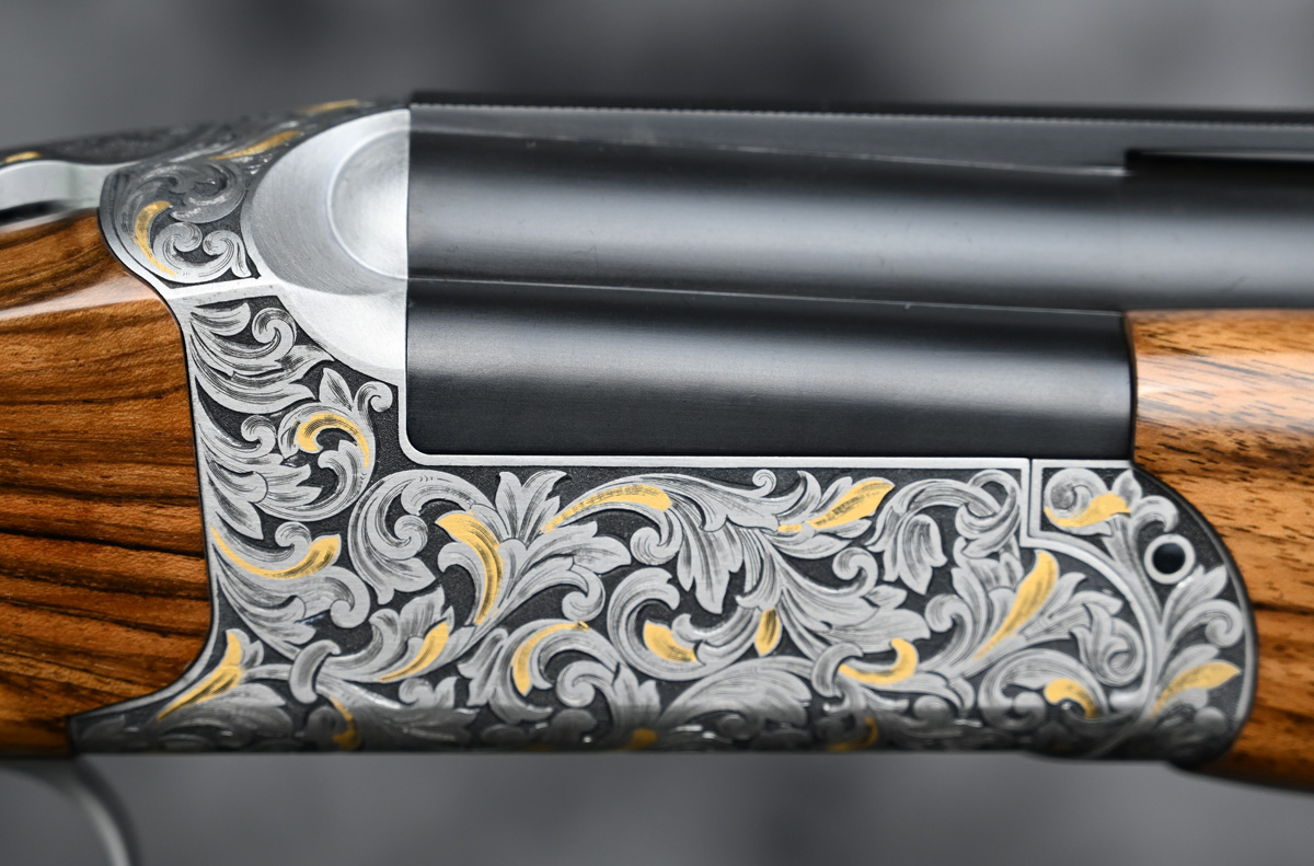 New Kolar Gold Grand Round Action Sporter 12ga. Features factory extended titanium choke tube 32″ barrel with ramp taper sporting rib. Engraved receiver featuring deep scroll patterns with gold highlights with removable selectable trigger. Highly figured right hand Sporting stock with adjustable comb and Round sporting forend. Comes in factory case.