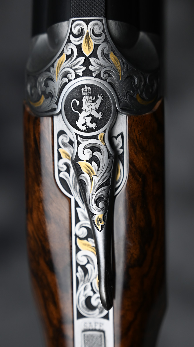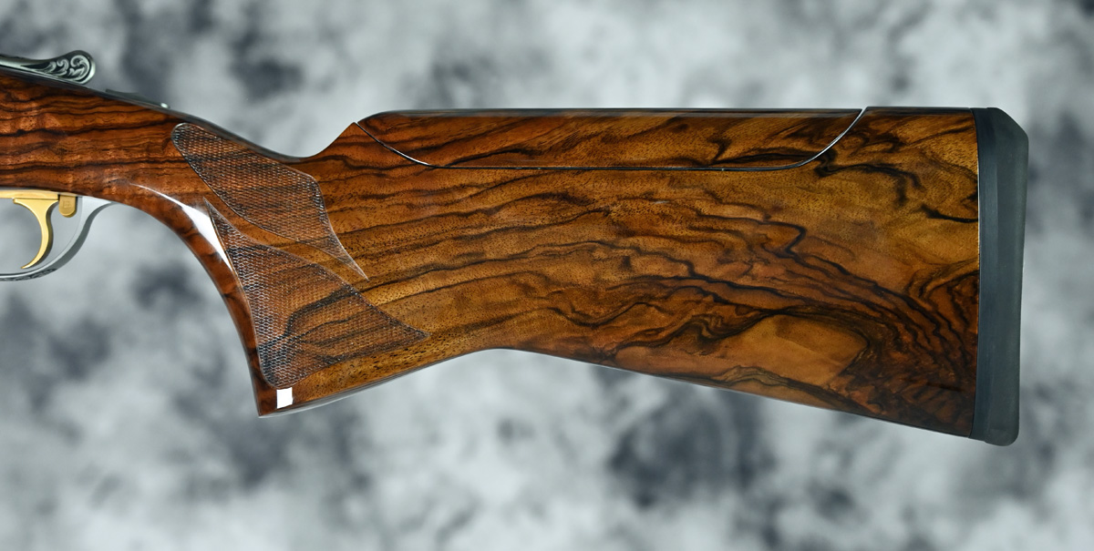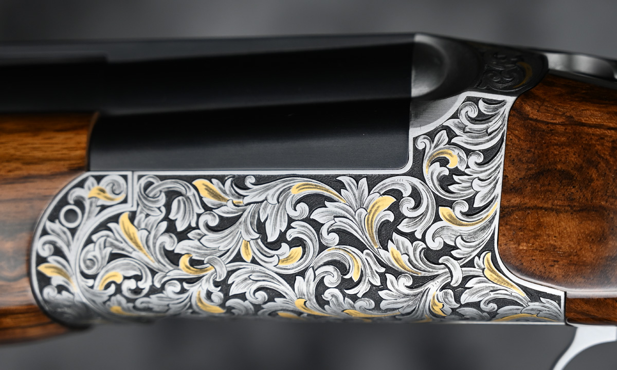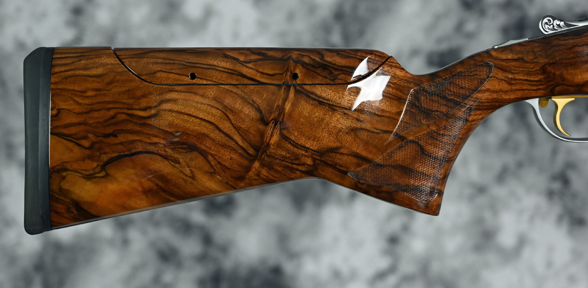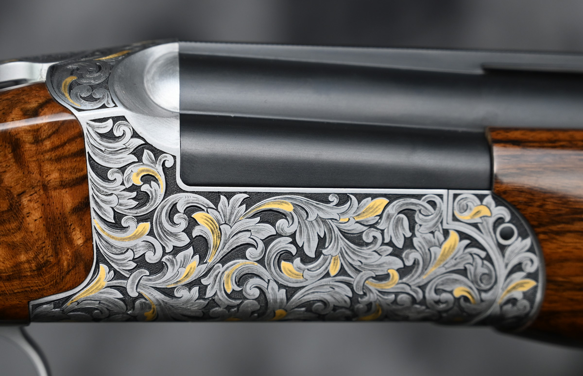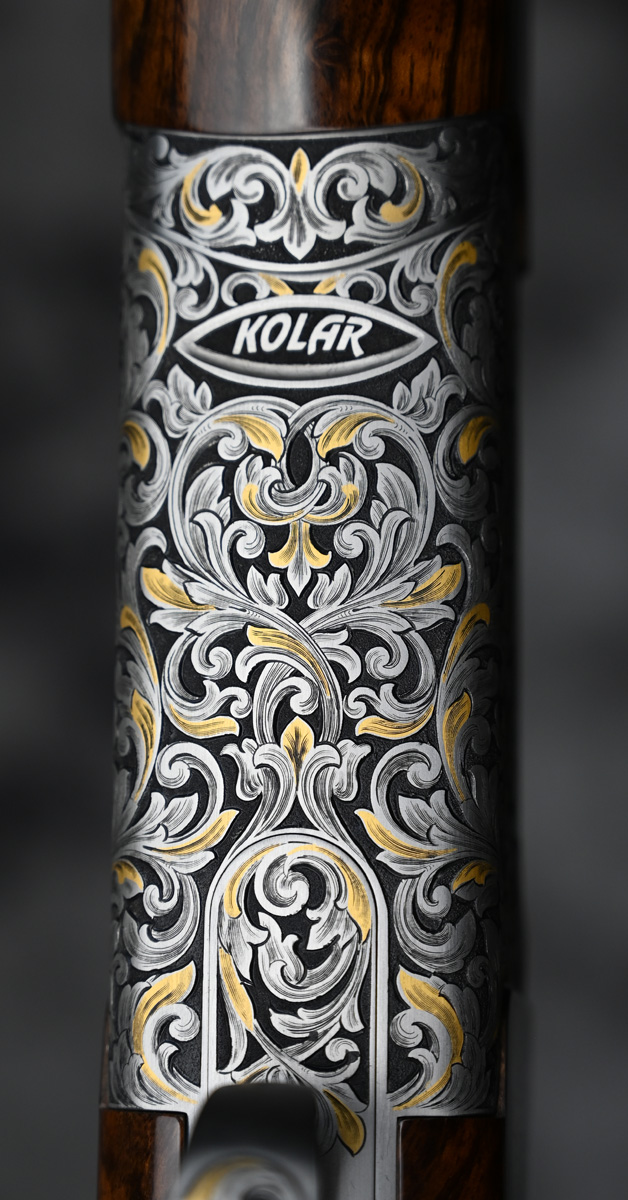 New Kolar Goldflat sporting rib. Engraved receiver featuring deep scroll patterns with gold highlights with removable selectable trigger. Highly figured right hand Sporting stock with adjustable comb and Round sporting forend. Comes in factory case.
