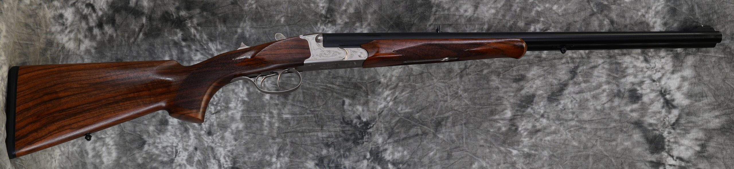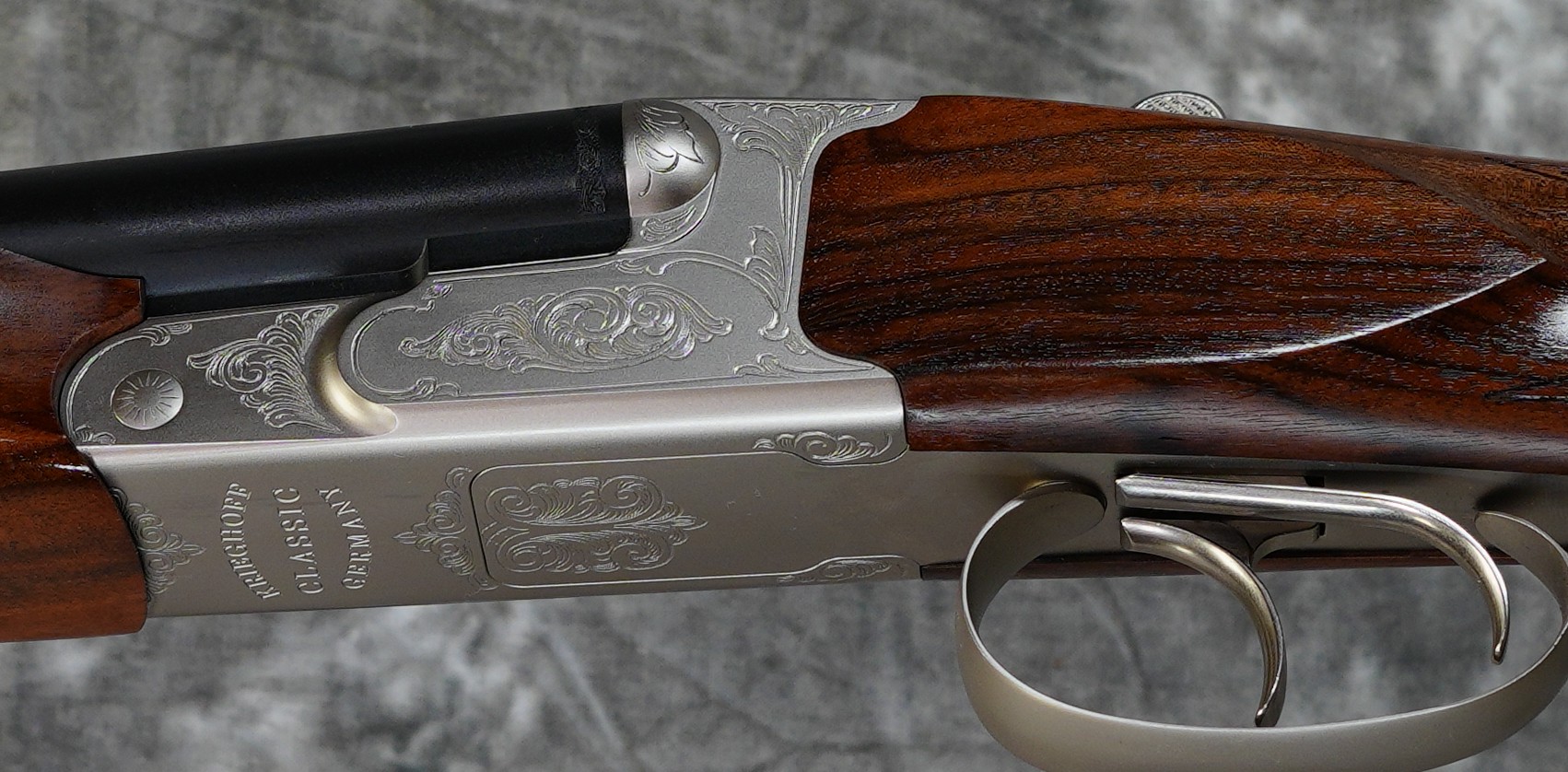 New Krieghoff Classic Double rifle. Features .470 Nitro Express barrels with factory ejectors. Standard Grade engraving on nickel receiver. Right-handed stock, double triggers. A great African dangerous game rifle.