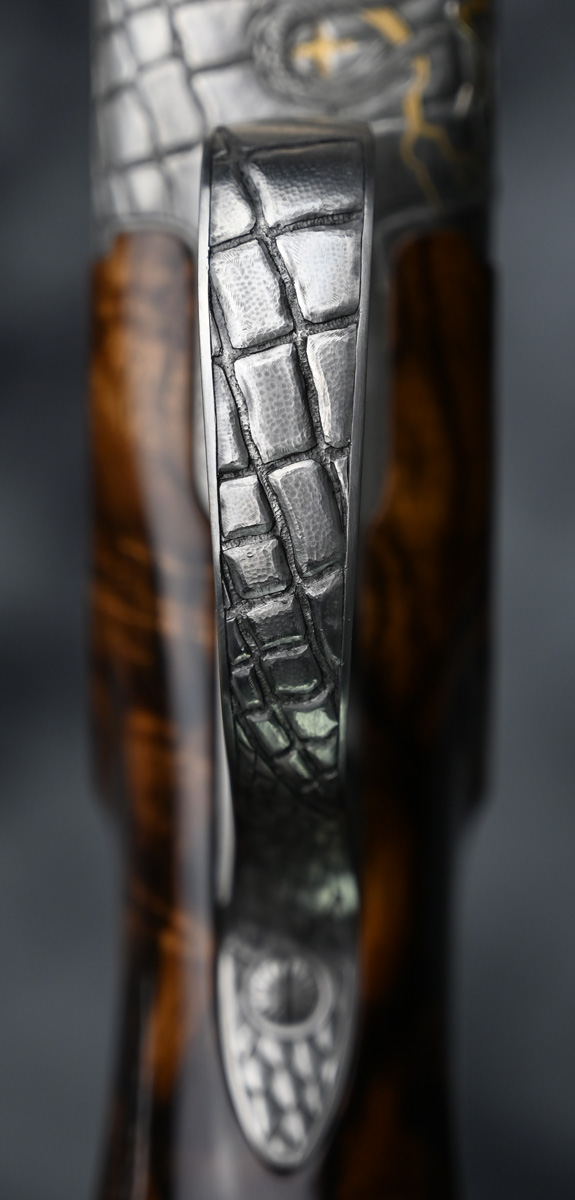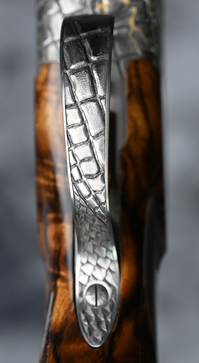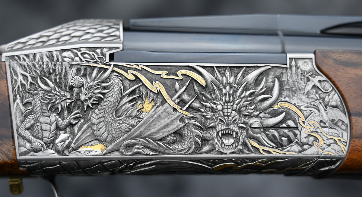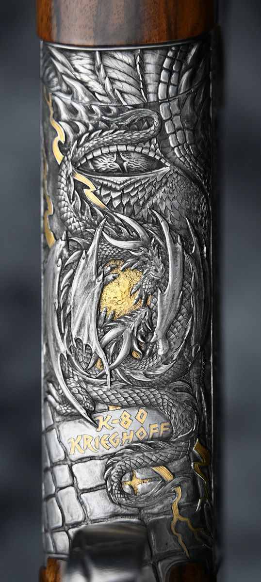 New Krieghoff K80 Custom One of a Kind Sporter 12ga. Features factory extended choke tube 32″ barrels with ramp taper sporting rib. Engraved receiver with One of a Kind engraving featuring deep dragon scenes with gold highlights hand engraved by German master engraver Federow. Outstanding right hand Monte Carlo Sporting stock with adjustable comb and Schnabel forend. Comes in factory leather case.