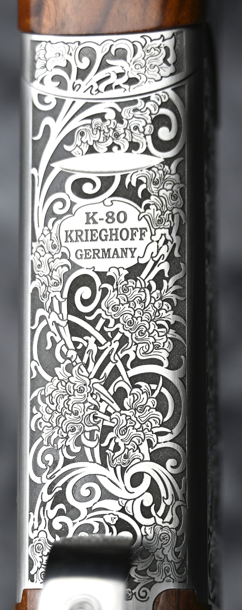 Brand New Krieghoff K80 Eleganza Parcour X Sporting 12ga. Features factory extended thin wall choke tube 32″ barrels with flat Parcour X rib. Beautiful Eleganza Scrolling engraving receiver with fixed selectable trigger. Right hand Parcours stock with adjustable comb and Parcour forend. Comes in factory leather trim case.