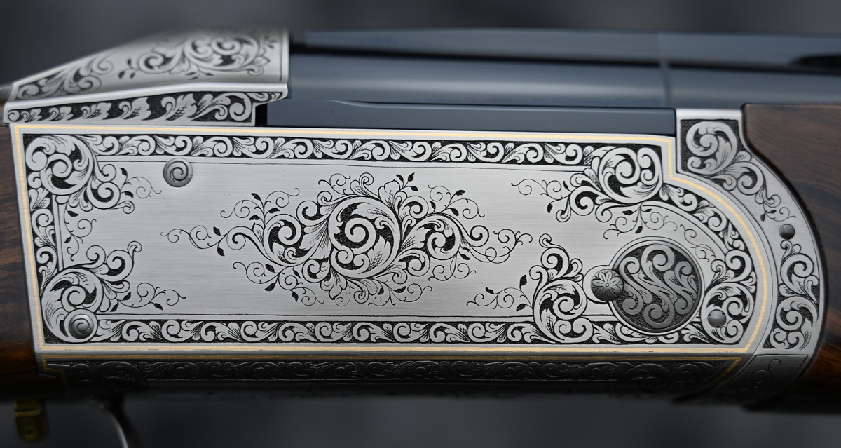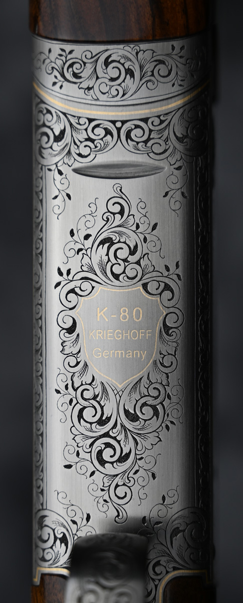 New Krieghoff K80 Heritage Scroll Parcour X 12ga. Features factory extended thin wall choke tube 32″ barrels with flat Parcour X rib. Engraved receiver featuring Heritage scroll engraving pattern hand engraved by German master engraver Reichte. Outstanding right hand Parcours stock with adjustable comb and Parcour forend. Comes in factory leather trim case.