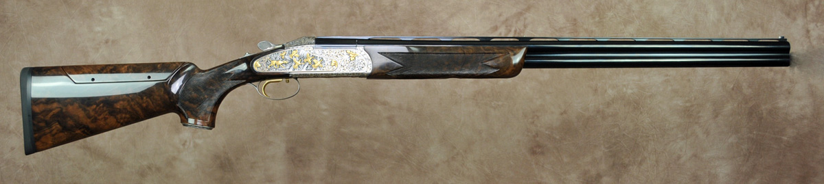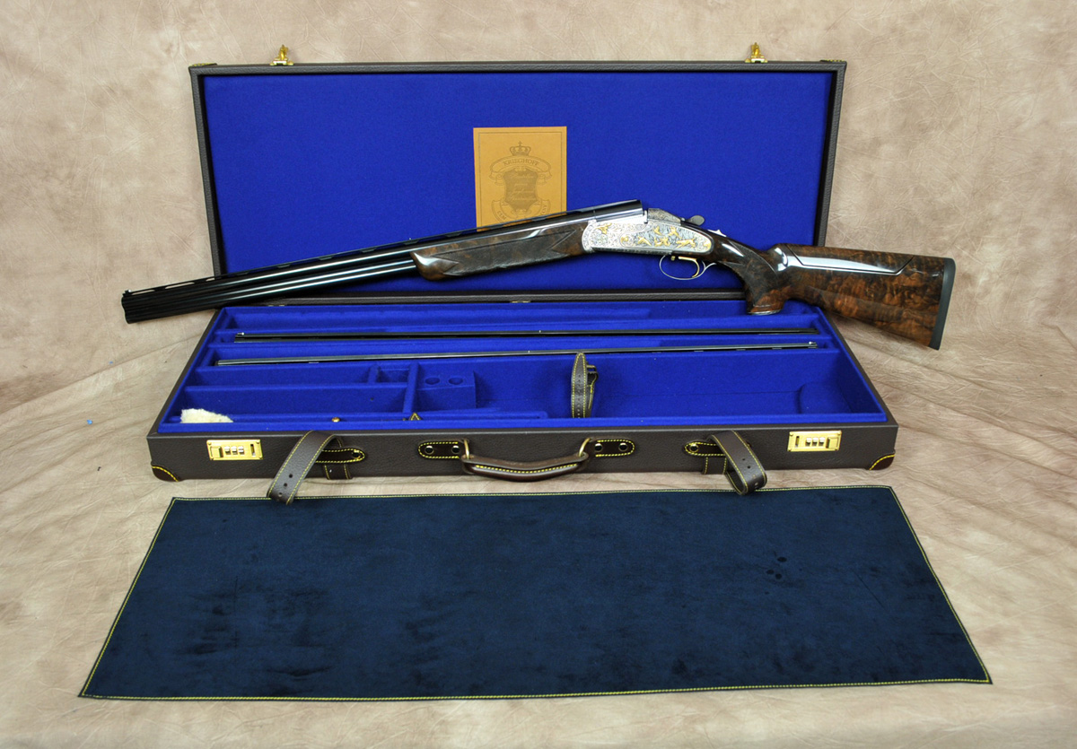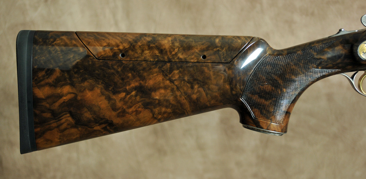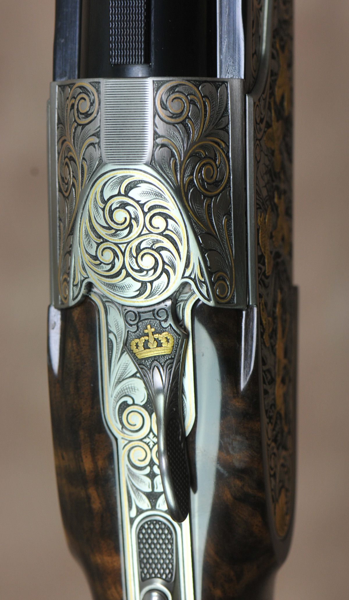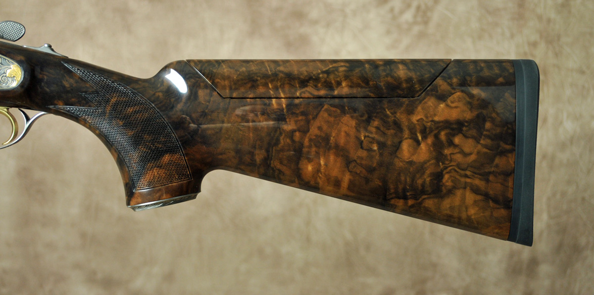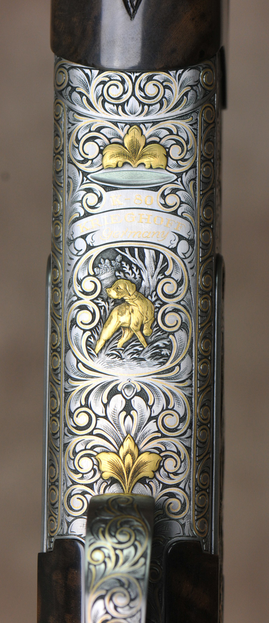 New Krieghoff K80/S Crown Parcours. Engraving by Heym, features 32″ Parcour barrels, 12/20 gauge 32″. Highly figured Exhibition grade Turkish walnut parcours stock and presentation case.