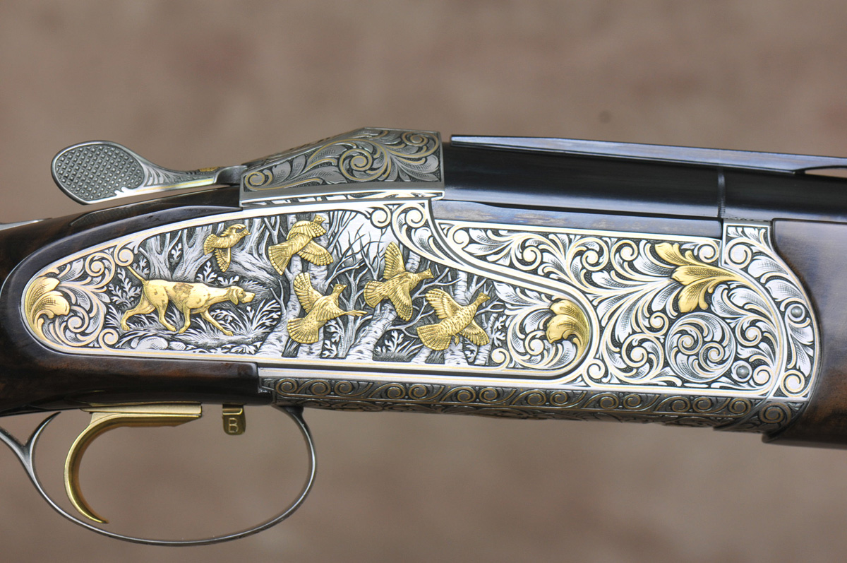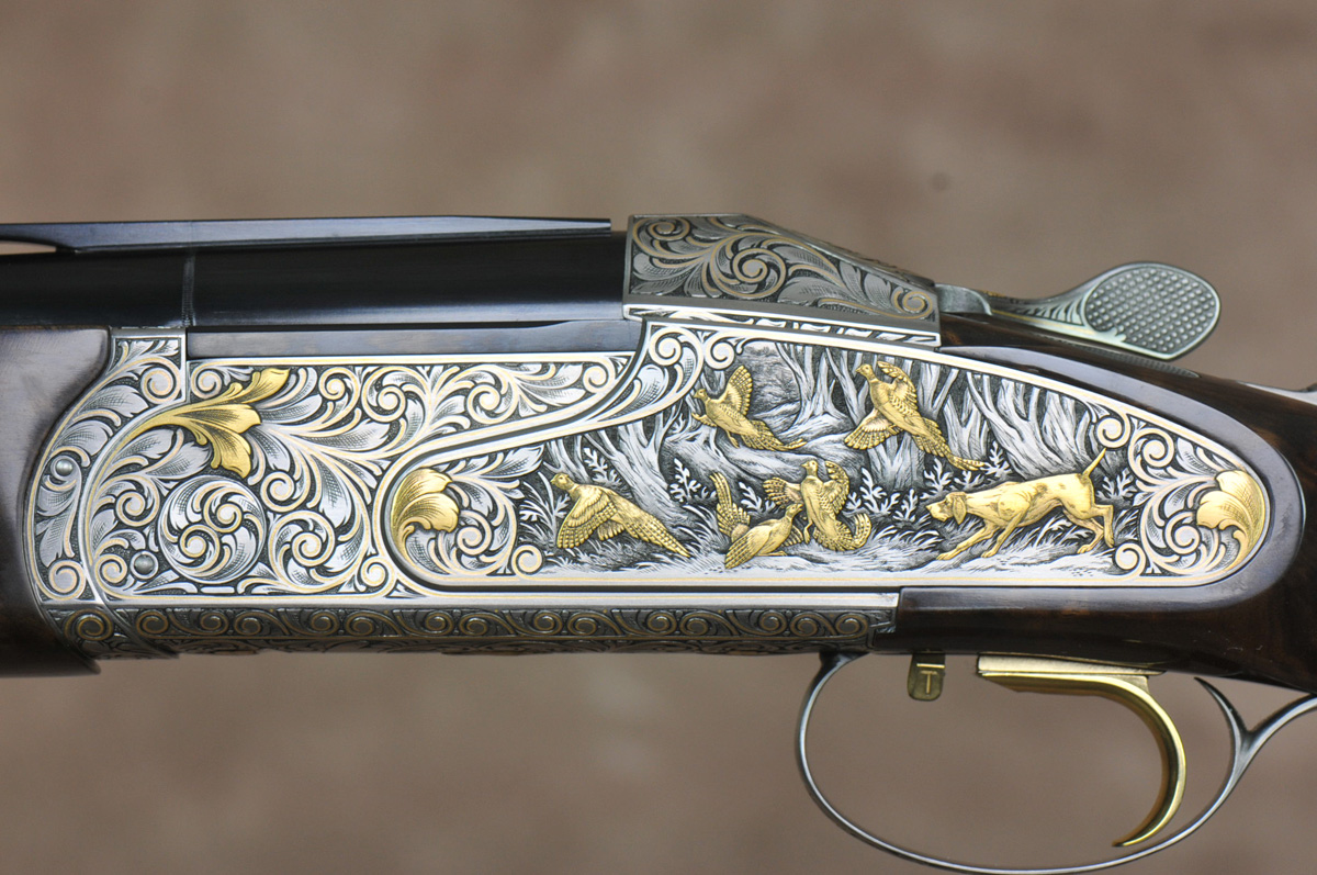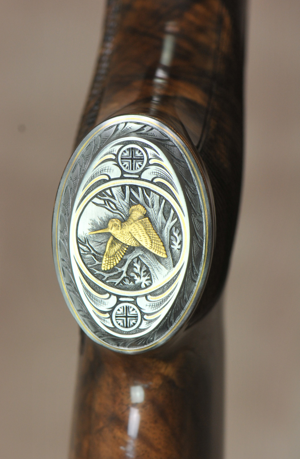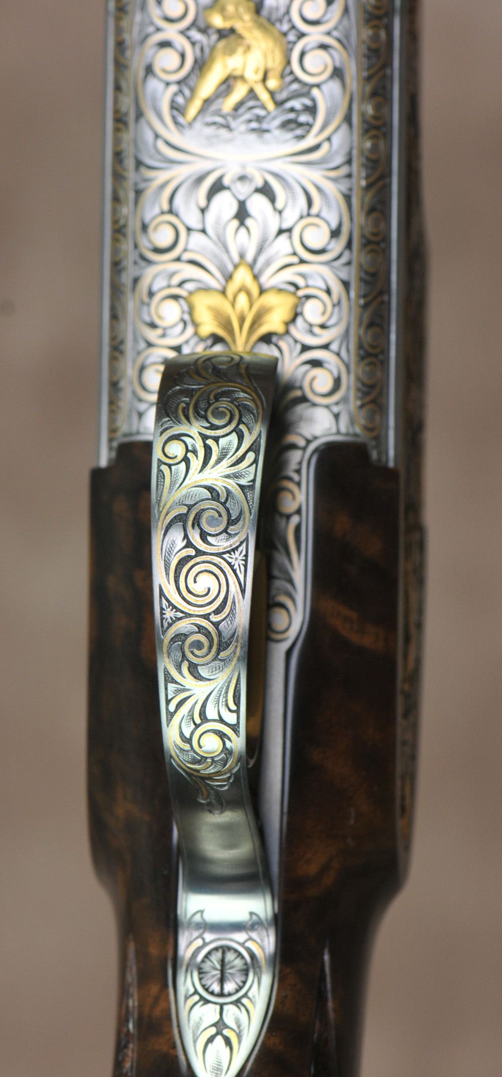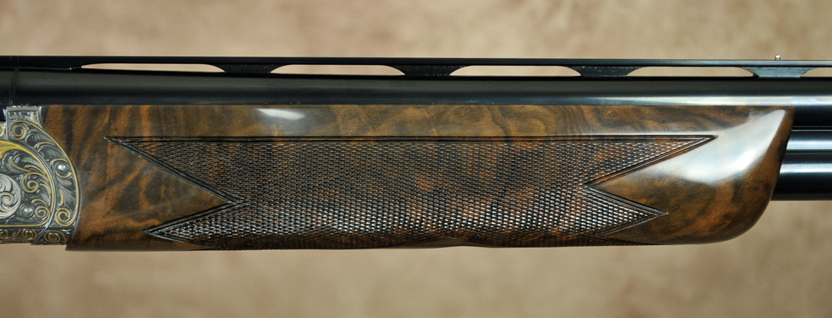 New Krieghoff K80/S Crown Parcours. Engraving by Heym, features 32″ Parcour barrels, 12/20 gauge 32″. Highly figured Exhibition grade Turkish walnut parcours stock and presentation case.