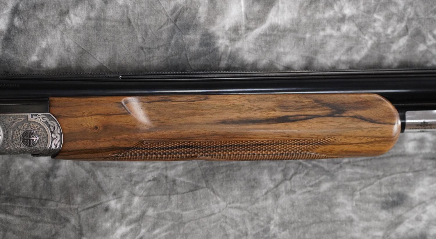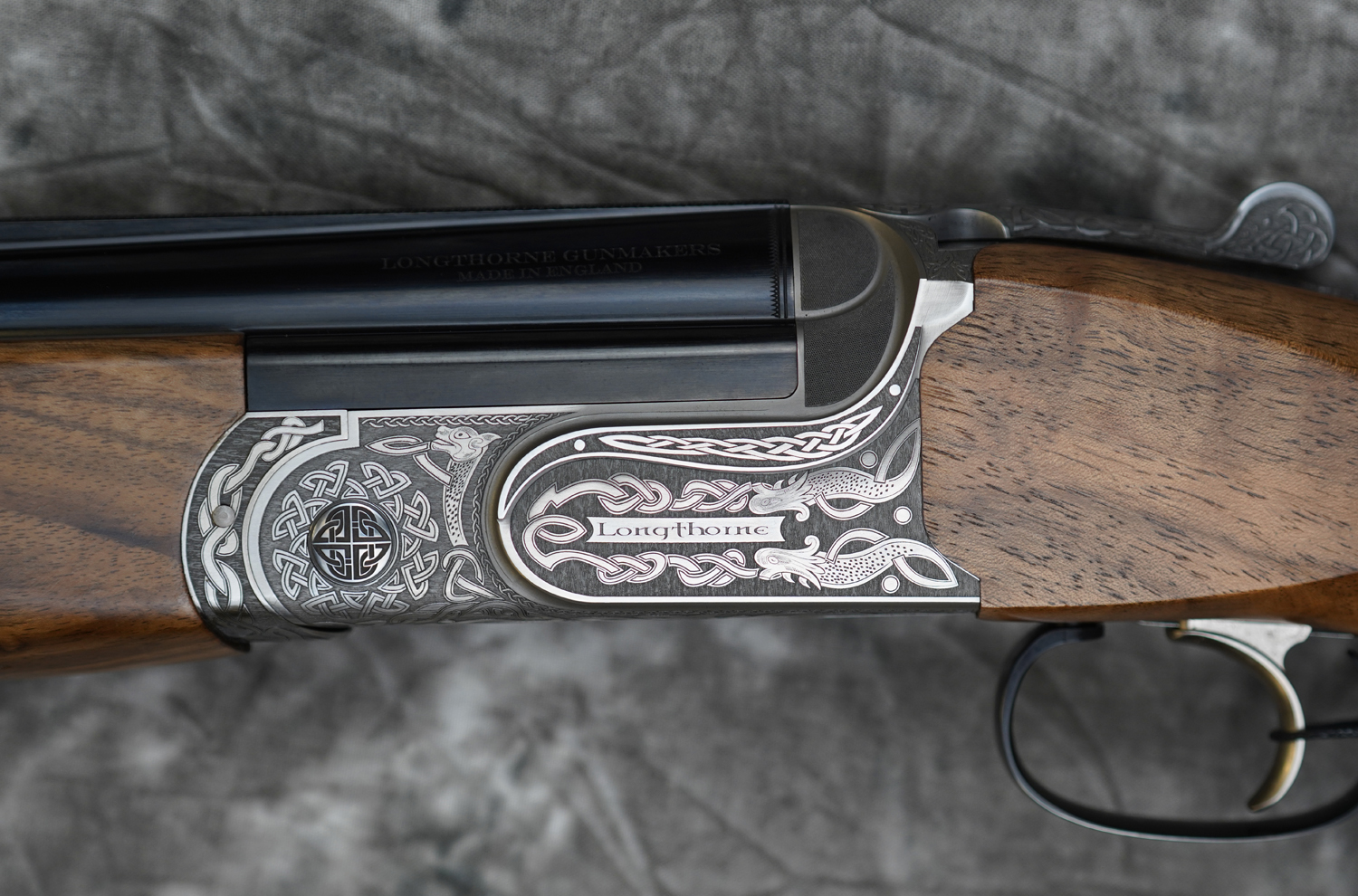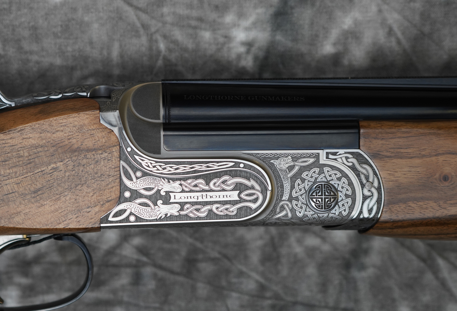New Longthorne 3004 Valhalla Sporting 12GA with 30″ monolithic Over/Under factory choke tubed barrels, factory flat-tapered rib. Nitride finished action featuring Celtic motifs and decoration. Factory adj. and selective trigger. Factory adj. comb sporting stock with right-hand palmswell and beavertail forearm. Includes factory case, chokes and tools.