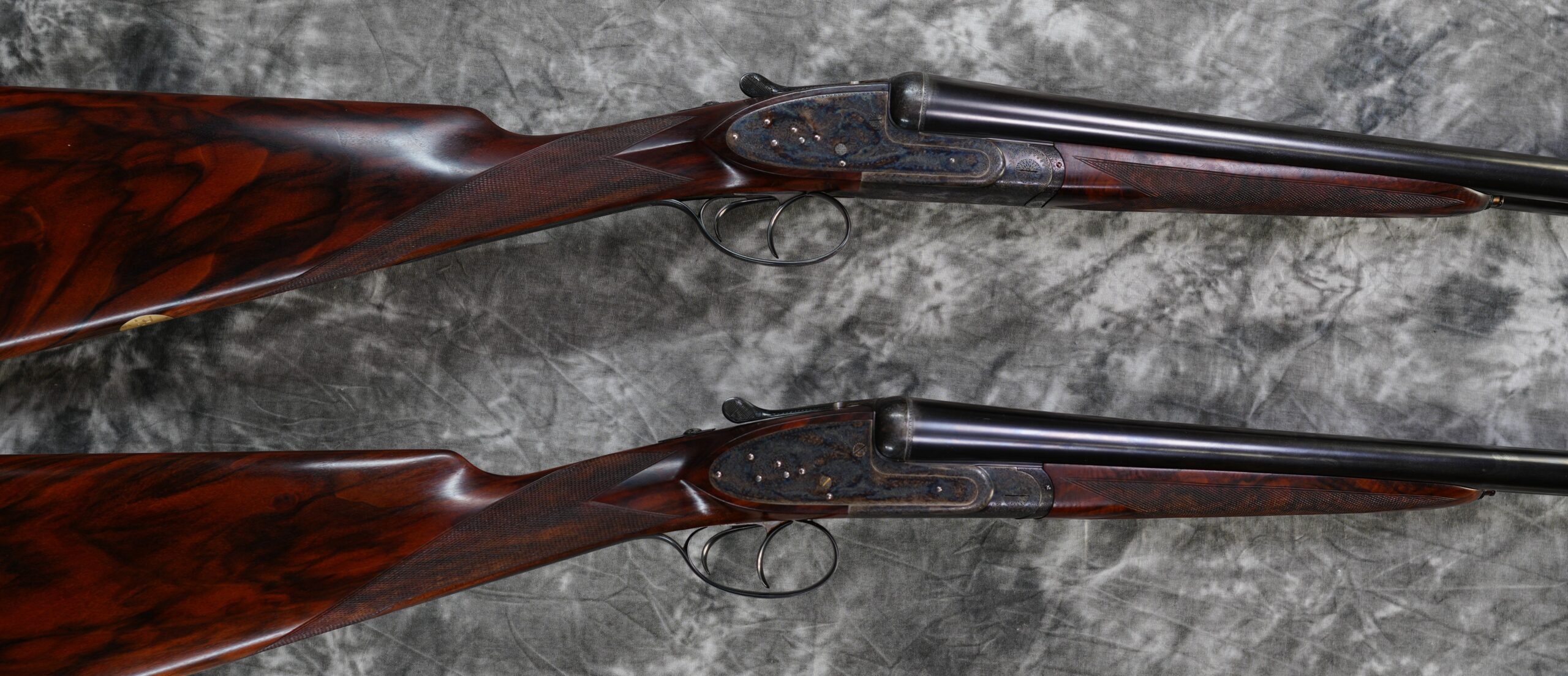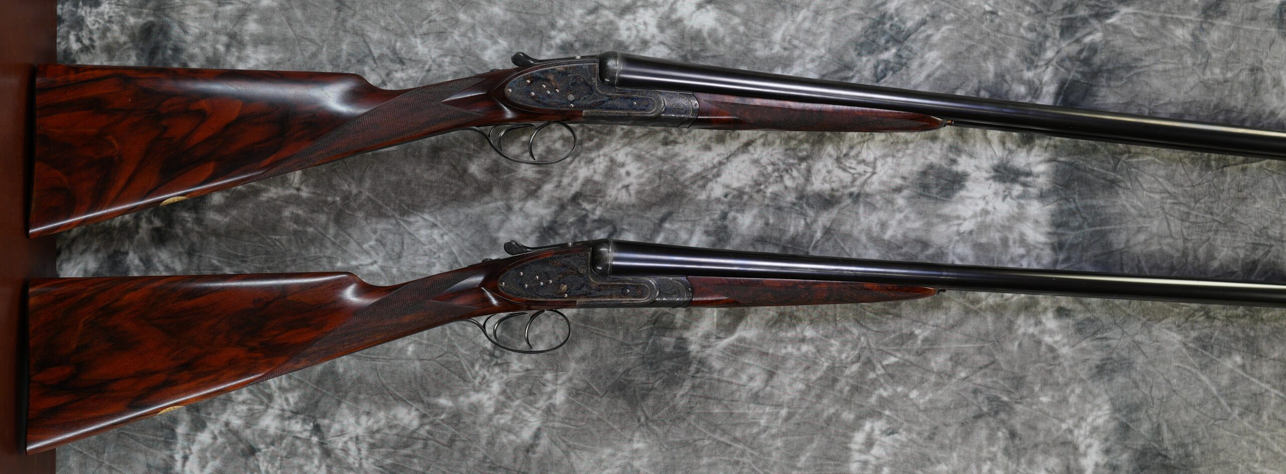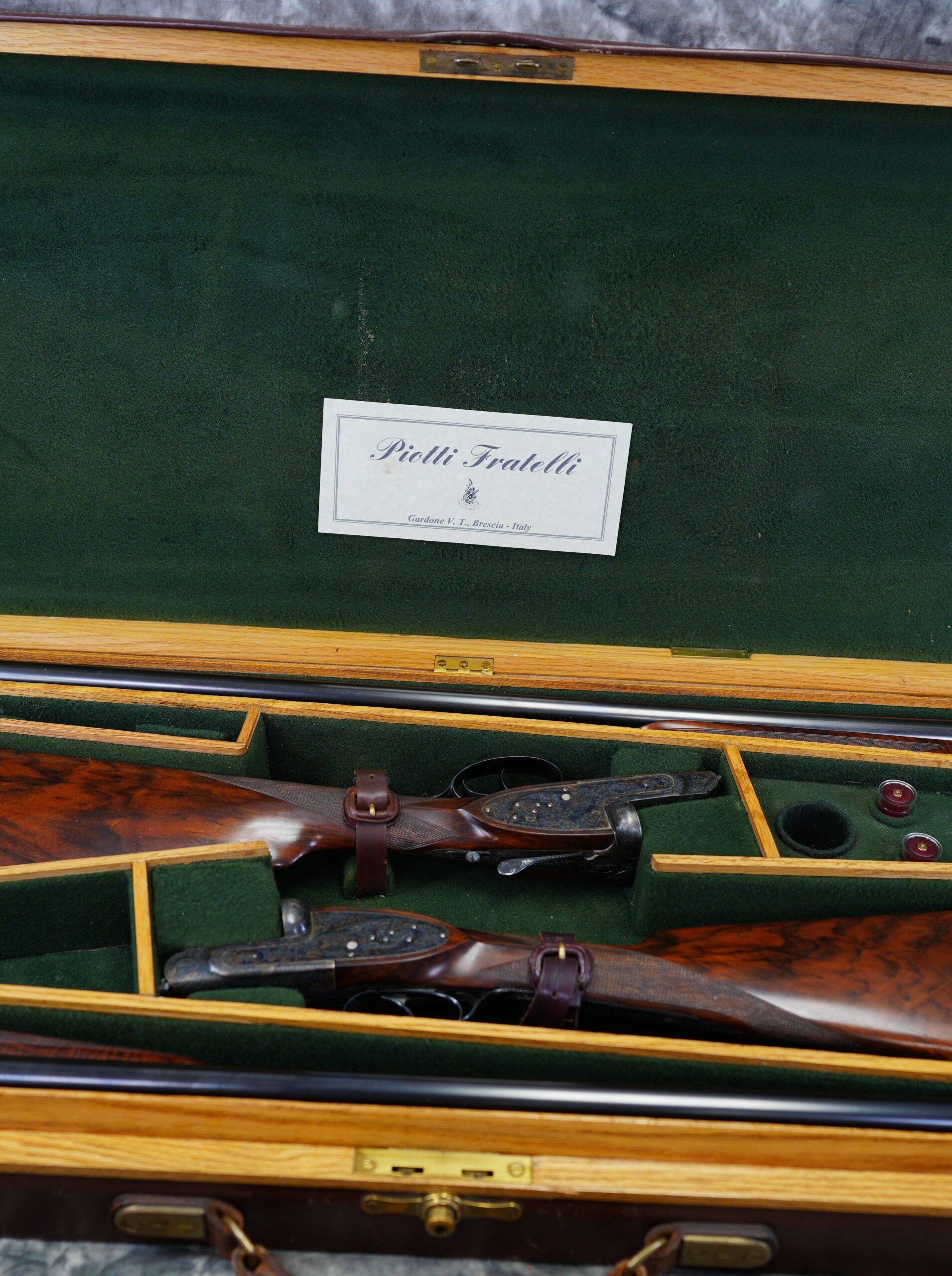 Pre-Owned Matched Pair of Piotti King Grade 12 bores. 27″ barrels choked IC/M. Full Holland & Holland 7 pin side lock actions. English stock, double triggers. 14 3/4″ lop. Marked #1 & #2 in gold. Detailed English scroll engraving case-colored receivers. Guns weigh 6lbs 7oz. Oak & Leather case with cover. Piotti is one of the finest makers of high-grade shotguns in the World.