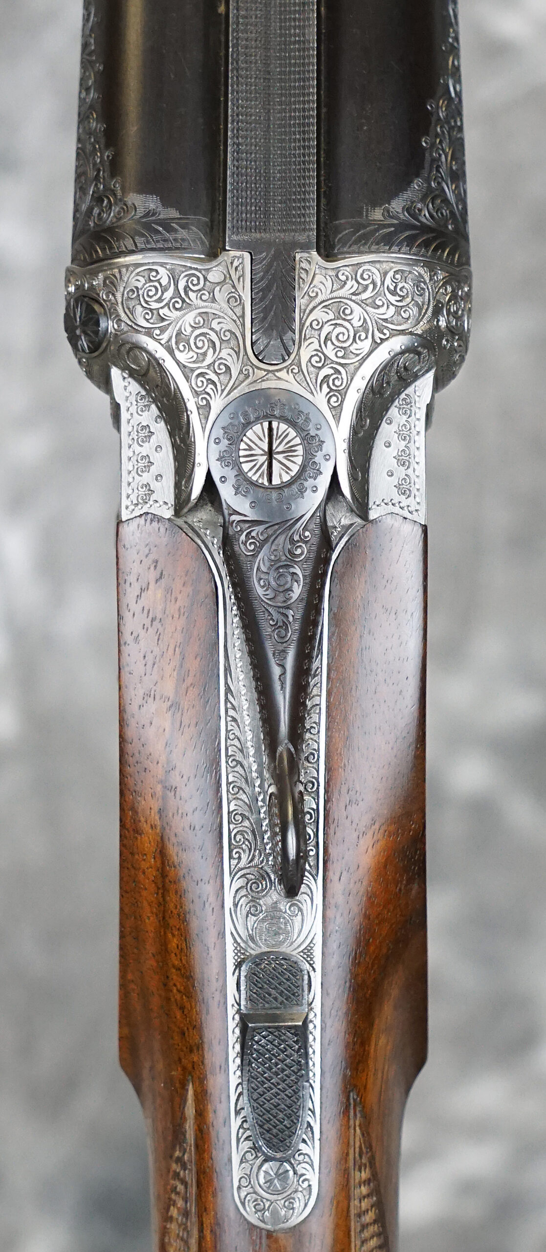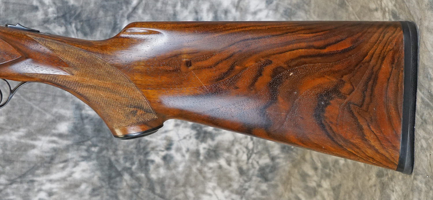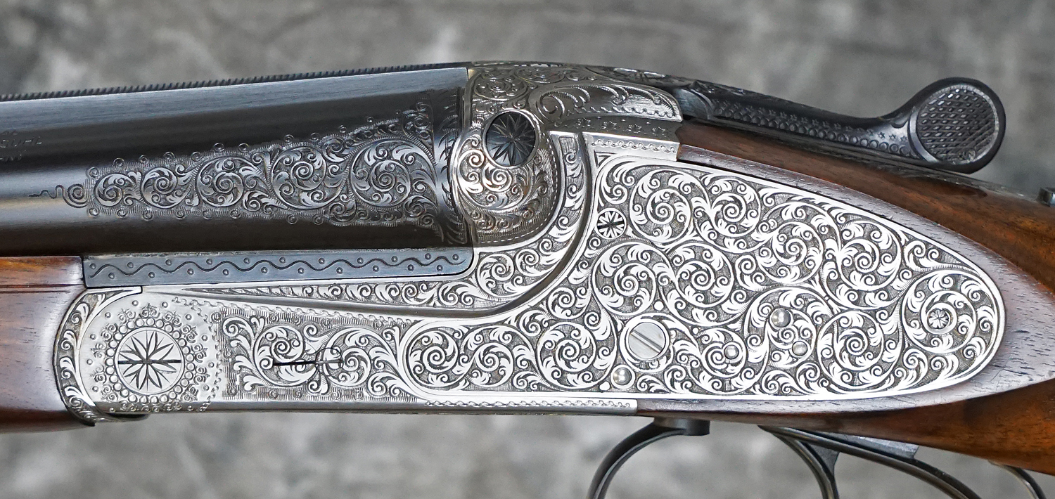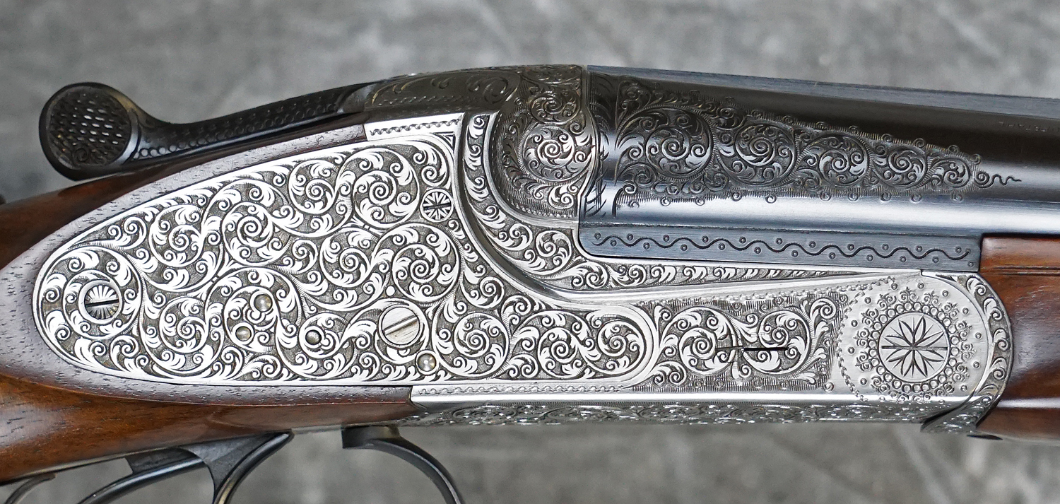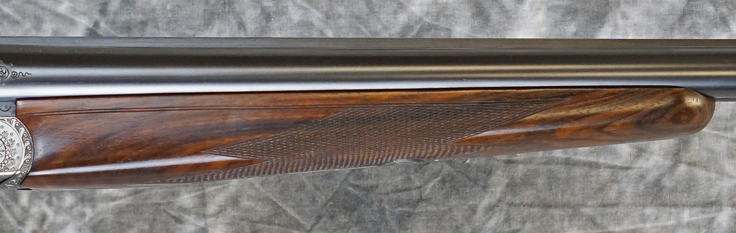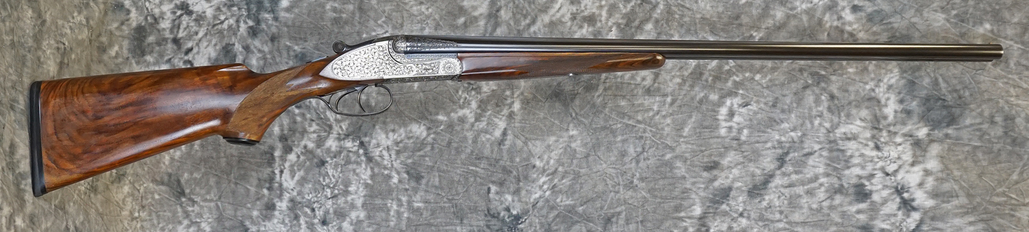 Pre-Owned Merkel 247 SL Sidelock-Ejector Game 20GA with 27″ fixed choke (IC/M) barrels, solid concave rib with engraved chambers. Nickel finished, fully hand-engraved sidelock action featuring deep Germanic scrolls, double triggers. Finish on barrels and action are in outstanding condition and only have the most minor wear. Factory pistol grip stock with handling marks, scratches and scuffs, splinter forearm with minor checkering wear. Does not include case. Consignment, ineligible for trade-ins.