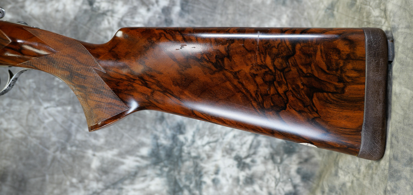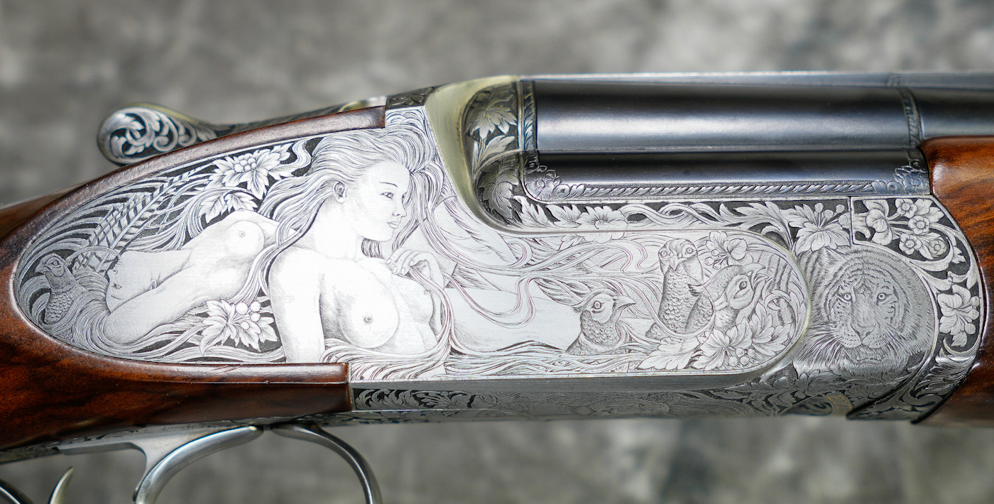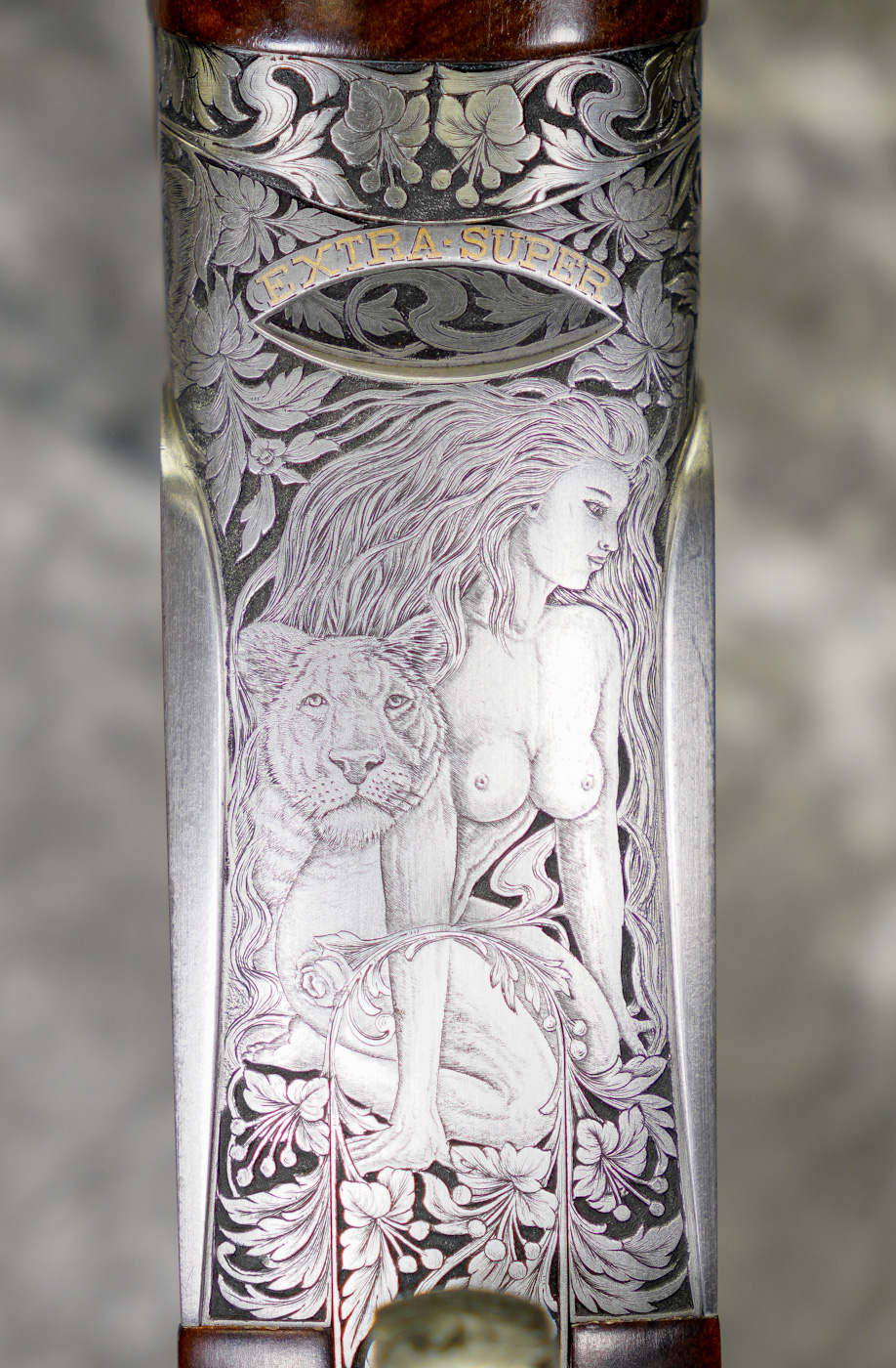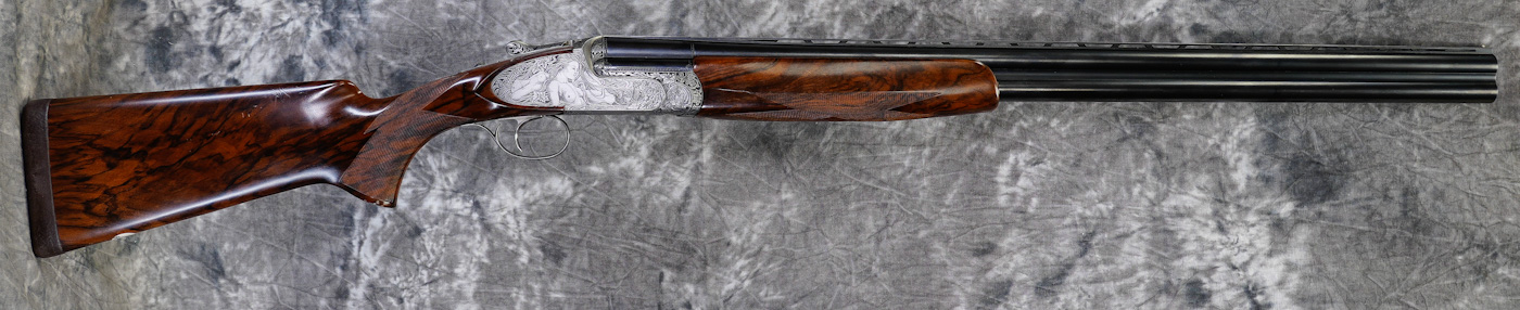 Pre-Owned Perazzi MX12 Extra Super Game 12GA with 28 3/8″ fixed choke (.016/.024) choked barrels with 7×7 parallel game rib and solid side-ribs, minor bluing wear on barrels. Coin finished action with side-plates, Best-Quality “Extra Super” engraving featuring fine florals and scrolls, nudes and game scenes with tigers and pheasants by Italian Master Engraver Laura Galeazzi. Finish is in excellent condition, minor knicks and wear on action. Factory fixed, coil-spring selective trigger. Highly figured game stock with game forearm with scuffs, handling marks and scratches, leather covered (aftermarket) recoil pad, initial oval inlaid in stock. Gun was originally gun No. 1 of matched pair. Includes case, papers. Factory replacement is $141,650. Consignment, ineligible for trade-ins.