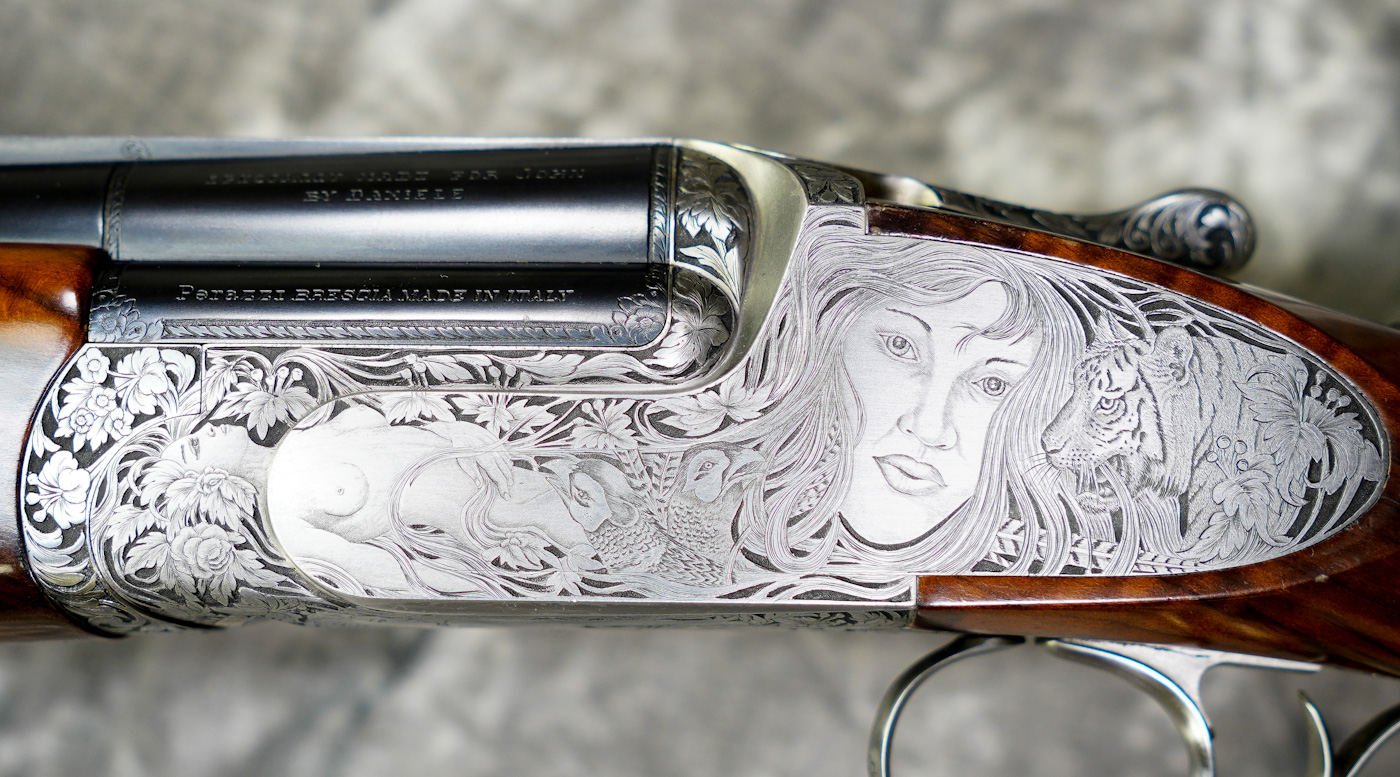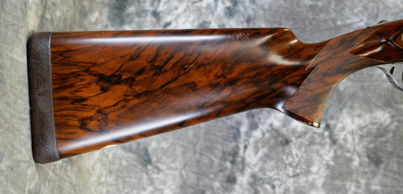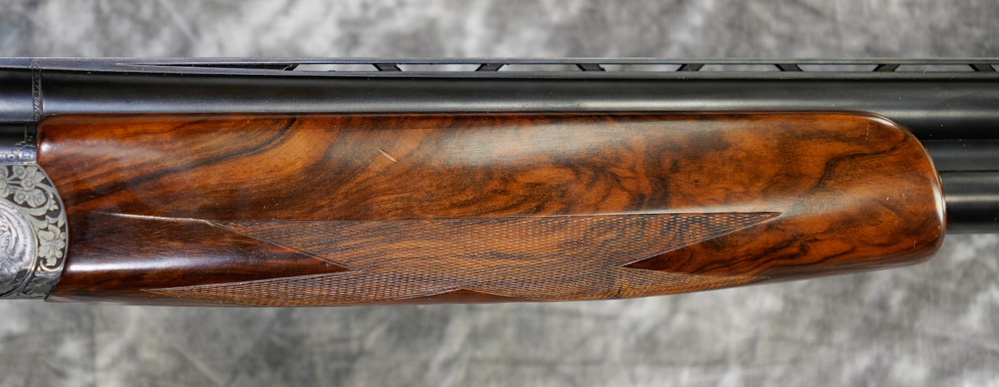 Pre-Owned Perazzi MX12 Extra Super Game 12GA with 28 3/8″ fixed choke (.016/.024) choked barrels with 7×7 parallel game rib and solid side-ribs, minor bluing wear on barrels. Coin finished action with side-plates, Best-Quality “Extra Super” engraving featuring fine florals and scrolls, nudes and game scenes with tigers and pheasants by Italian Master Engraver Laura Galeazzi. Finish is in excellent condition, minor knicks and wear on action. Factory fixed, coil-spring selective trigger. Highly figured game stock with game forearm with scuffs, handling marks and scratches, leather covered (aftermarket) recoil pad, initial oval inlaid in stock. Gun was originally gun No. 1 of matched pair. Includes case, papers. Factory replacement is $141,650. Consignment, ineligible for trade-ins.