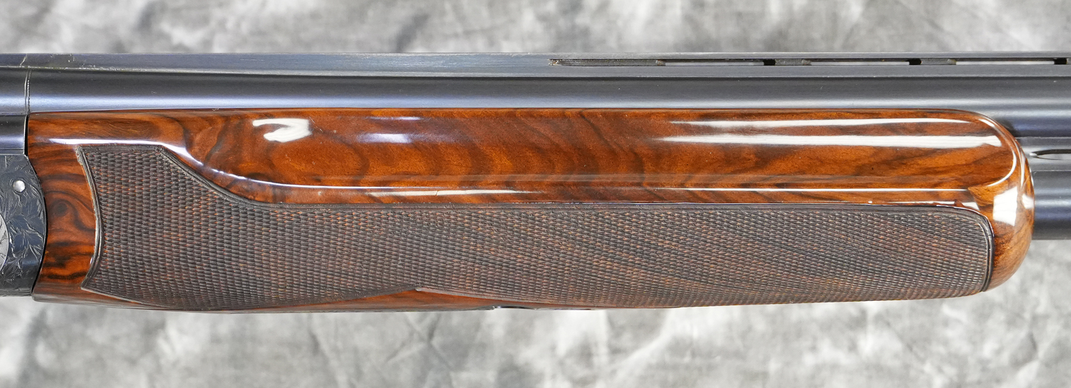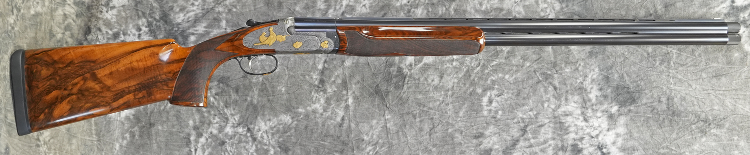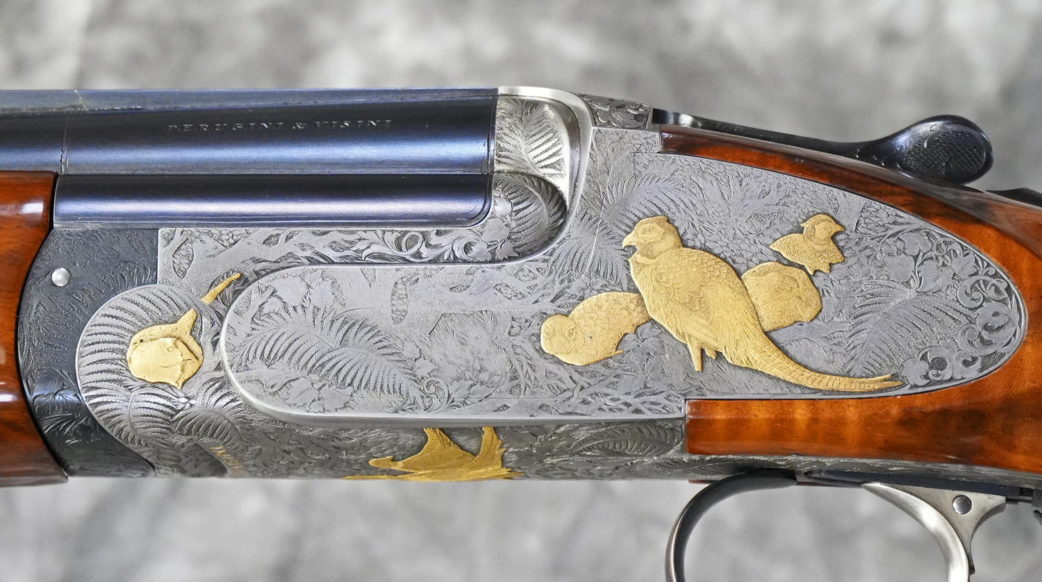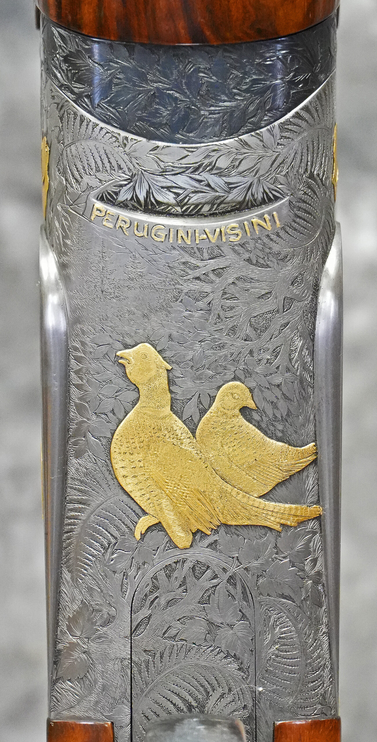 Pre-Owned Perugini and Visini Custom Pigeon or Olympic Trap 12GA with 30″ Briley Choked barrels, 10x10mm parallel rib with thumbnail checkering and white blade sight, barrels are not original to action and have been fit and professionally re-numbered. Coin finished action featuring finely engraved scrolls and forest scenes with deeply engraved gold inlaid game birds, fully hand-engraved by Reno Greco. Factory removable, non selective adj. trigger. Factory pistol grip stock with right-hand palmswell and beavertail forearm. Minor handling marks, minor scuffs and scratches on stock/forearm, minor bluing wear on barrels-overall very good condition. Includes case, Briley chokes. Consignment, ineligible for trade-ins.
