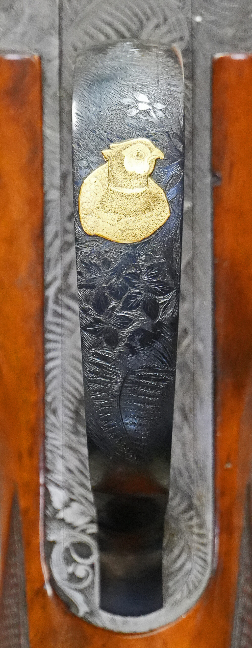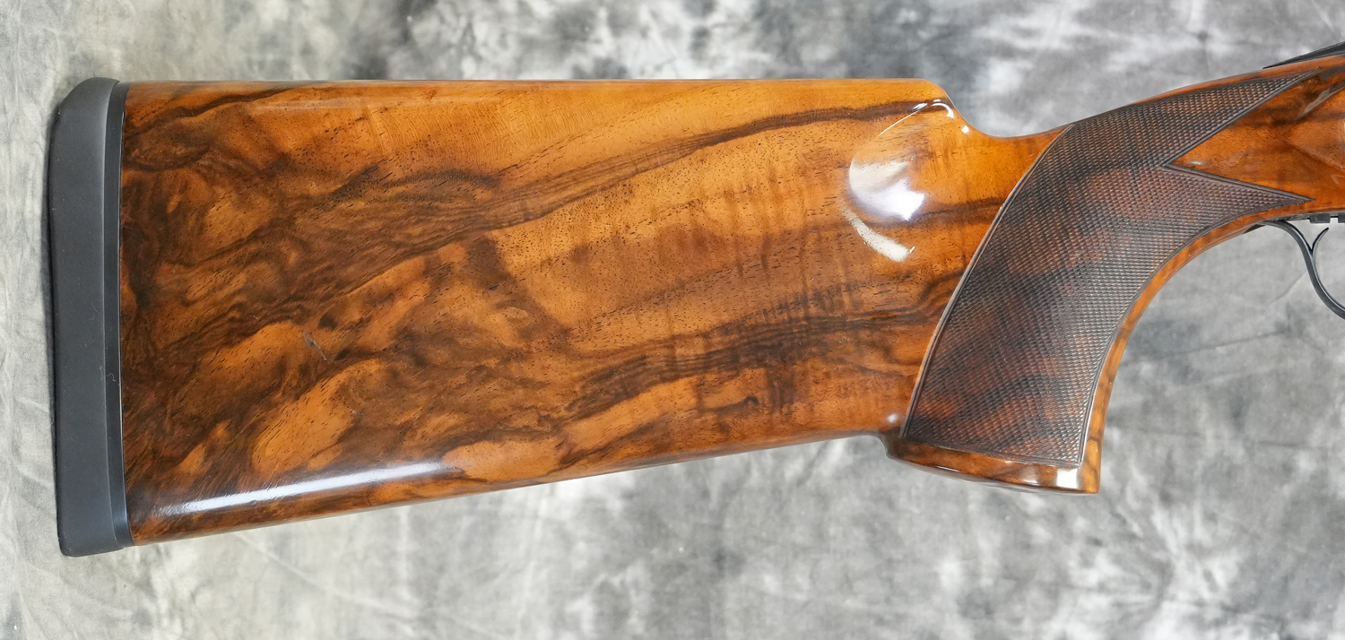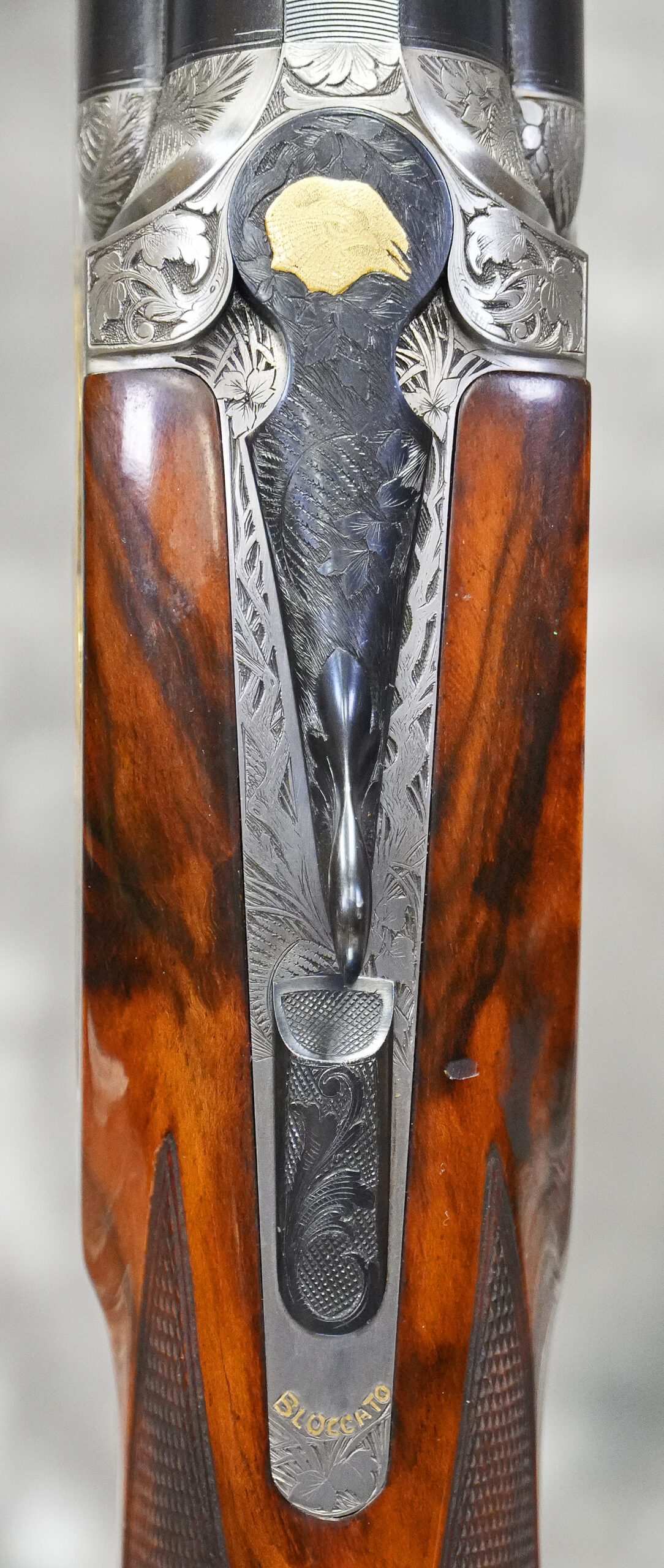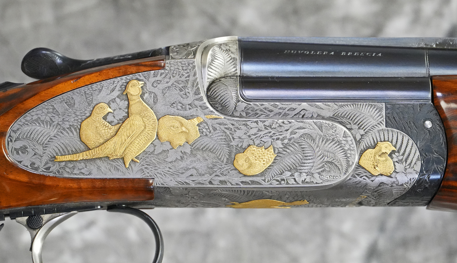 Pre-Owned Perugini and Visini Custom Pigeon or Olympic Trap 12GA with 30″ Briley Choked barrels, 10x10mm parallel rib with thumbnail checkering and white blade sight, barrels are not original to action and have been fit and professionally re-numbered. Coin finished action featuring finely engraved scrolls and forest scenes with deeply engraved gold inlaid game birds, fully hand-engraved by Reno Greco. Factory removable, non selective adj. trigger. Factory pistol grip stock with right-hand palmswell and beavertail forearm. Minor handling marks, minor scuffs and scratches on stock/forearm, minor bluing wear on barrels-overall very good condition. Includes case, Briley chokes. Consignment, ineligible for trade-ins.