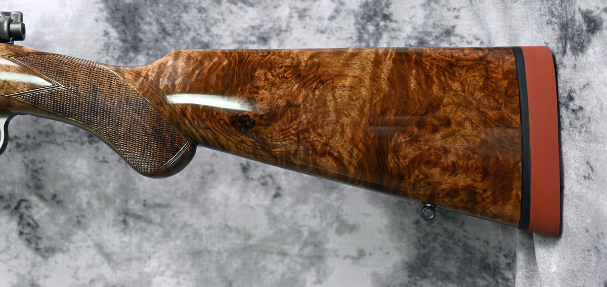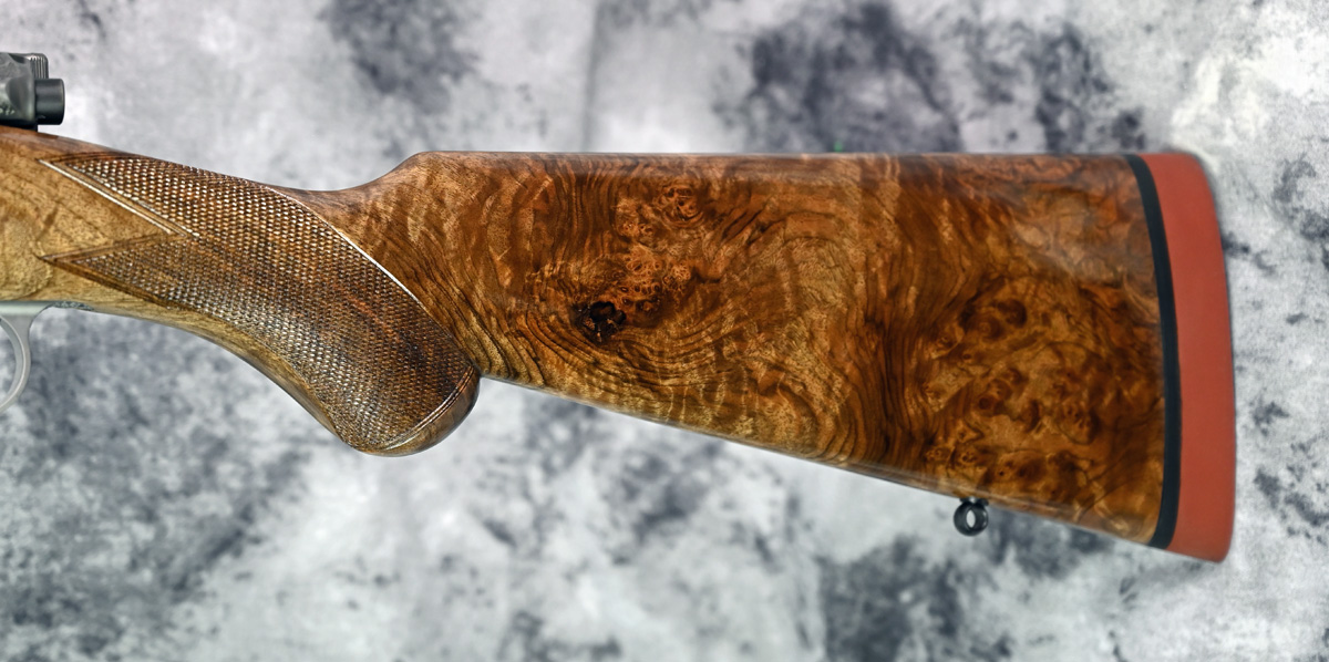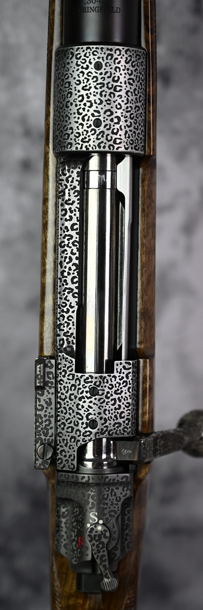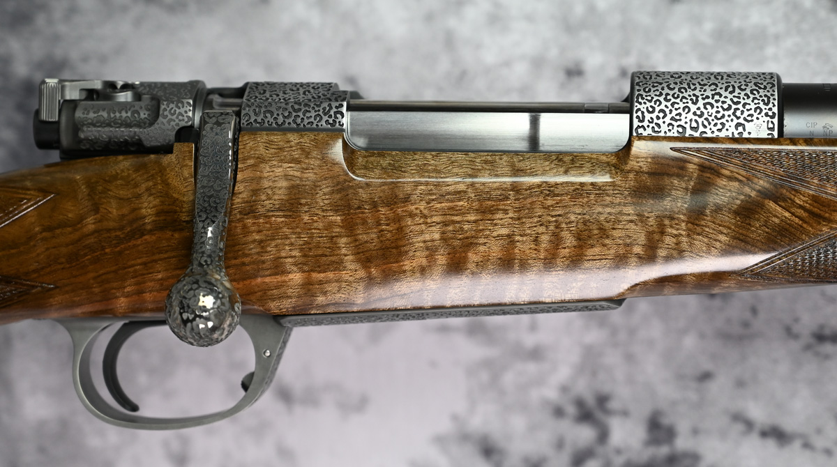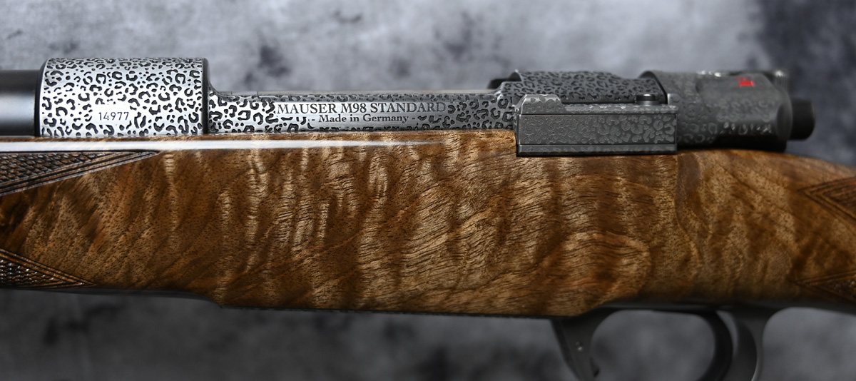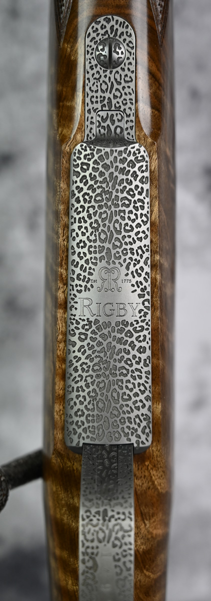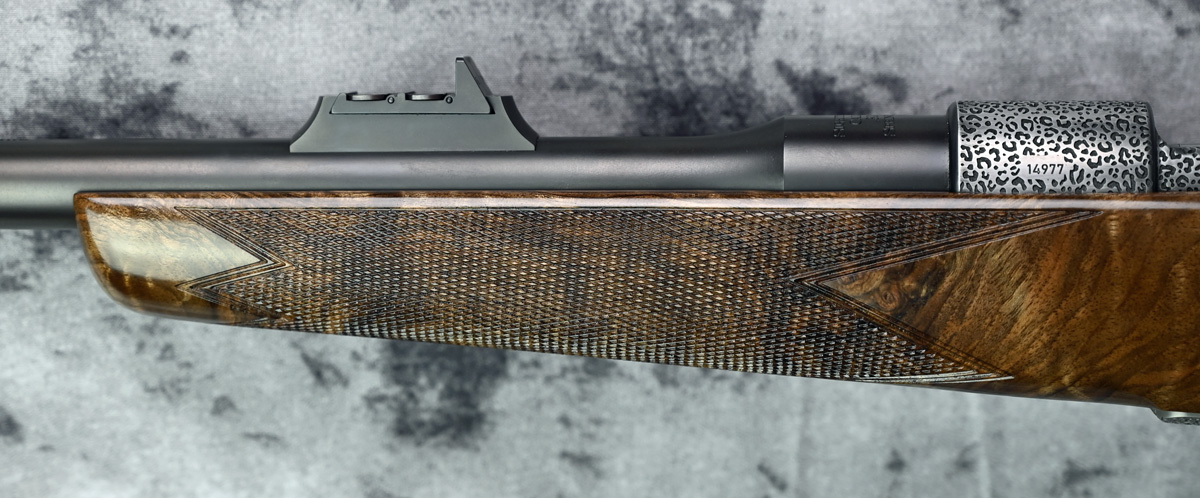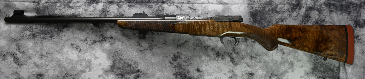 New Rigby Highland Stalker “Leopard” 30.06 Springfield. Features 22″ barrel and fixed iron sights with additional flip sight for 150 and 250 yards. Engraved Mauser M98 action featuring Crocodile engraving throughout with highly polished bolt. Outstanding right hand Prince of Wales stock with sling swivels. Comes in factory case.